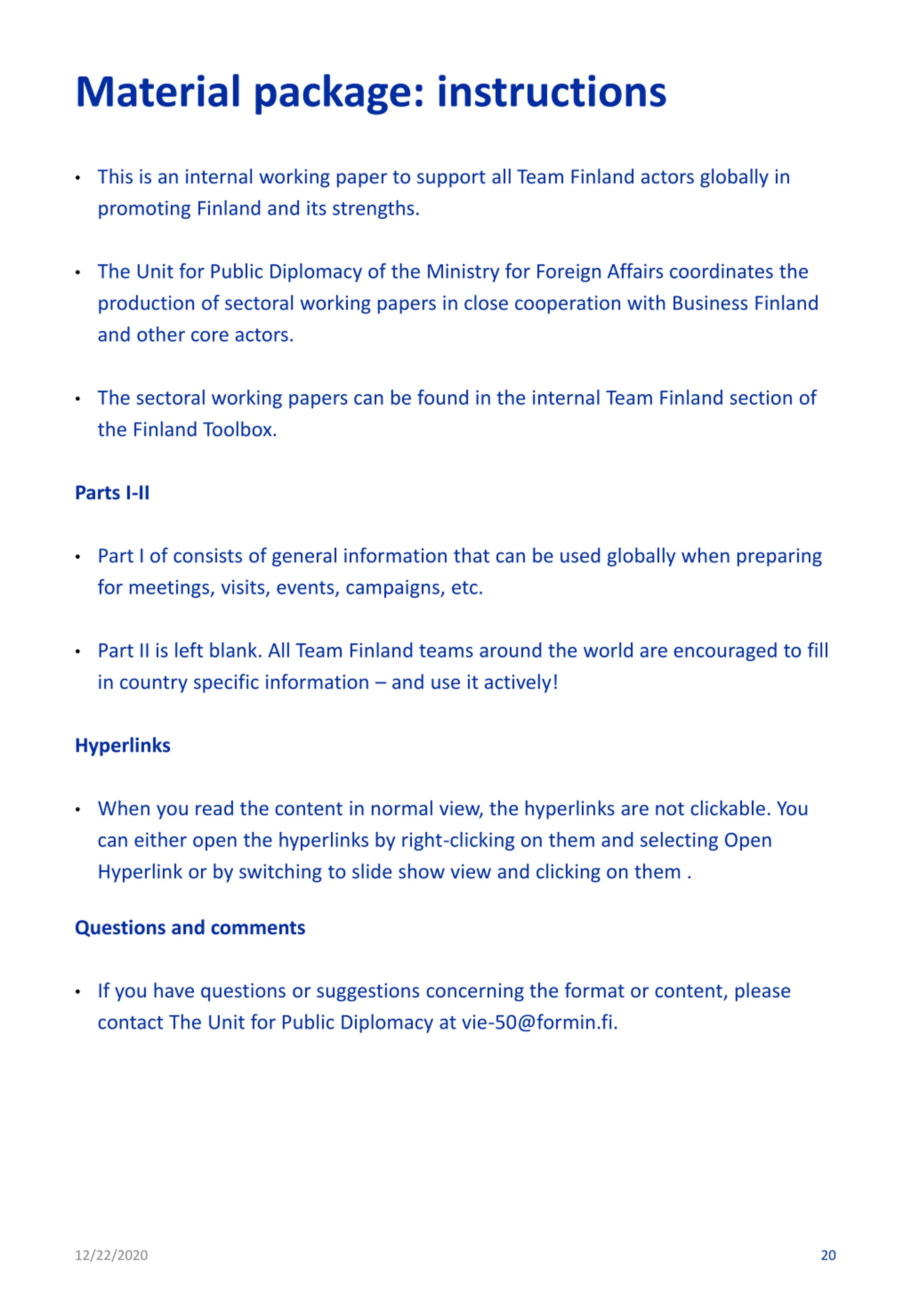 Material package: instructions This is an internal working paper to support all Team Finland actors globally in promoting Finland and its strengths. The Unit for Public Diplomacy of the Ministry for Foreign Affairs coordinates the production of sectoral working papers in close cooperation with Business Finland and other core actors. The sectoral working papers can be found in the internal Team Finland section of the Finland Toolbox. Parts I-II Part I of consists of general information that can be used globally when preparing for meetings, visits, events, campaigns, etc. Part II is left blank. All Team Finland teams around the world are encouraged to fill in country specific information and use it actively! Hyperlinks When you read the content in normal view, the hyperlinks are not clickable. You can either open the hyperlinks by right-clicking on them and selecting Open Hyperlink or by switching to slide show view and clicking on them . Questions and comments If you have questions or suggestions concerning the format or content, please contact The Unit for Public Diplomacy at vie-50@formin.fi. 12/22/2020 20