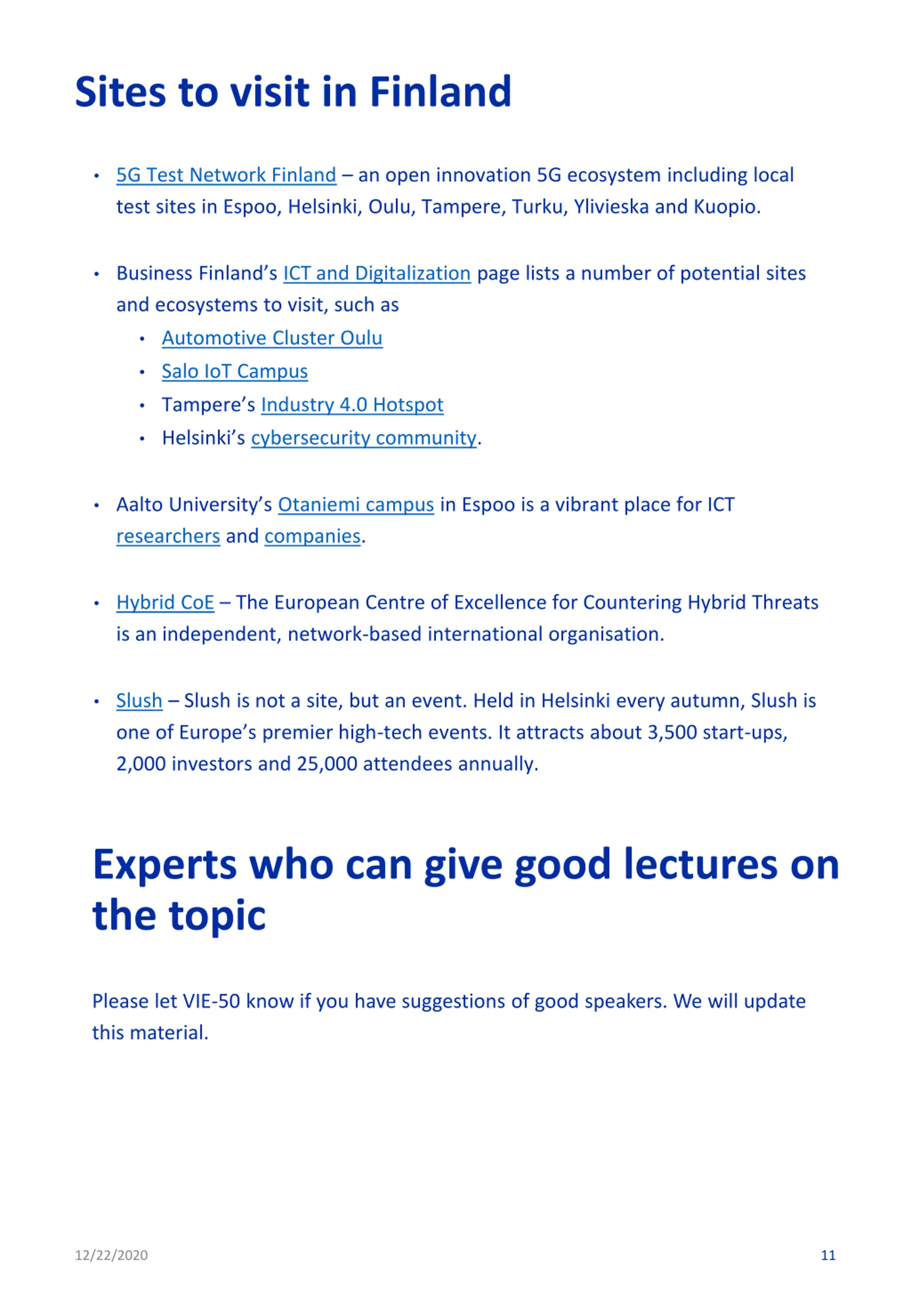 Sites to visit in Finland 5G Test Network Finland an open innovation 5G ecosystem including local test sites in Espoo, Helsinki, Oulu, Tampere, Turku, Ylivieska and Kuopio. Business Finland s ICT and Digitalization page lists a number of potential sites and ecosystems to visit, such as Automotive Cluster Oulu Salo IoT Campus Tampere s Industry 4.0 Hotspot Helsinki s cybersecurity community. Aalto University s Otaniemi campus in Espoo is a vibrant place for ICT researchers and companies. Hybrid CoE The European Centre of Excellence for Countering Hybrid Threats is an independent, network-based international organisation. Slush Slush is not a site, but an event. Held in Helsinki every autumn, Slush is one of Europe s premier high-tech events. It attracts about 3,500 start-ups, 2,000 investors and 25,000 attendees annually. Experts who can give good lectures on the topic Please let VIE-50 know if you have suggestions of good speakers. We will update this material. 12/22/2020 11