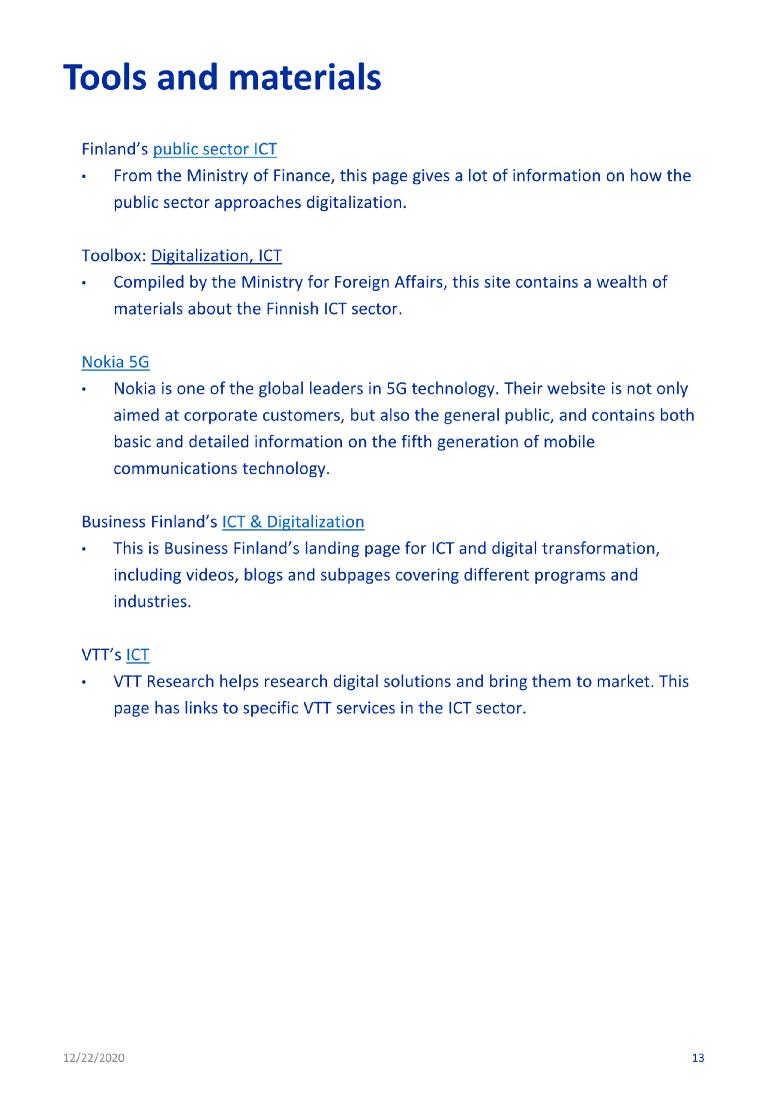 Tools and materials Finland s public sector ICT From the Ministry of Finance, this page gives a lot of information on how the public sector approaches digitalization. Toolbox: Digitalization, ICT Compiled by the Ministry for Foreign Affairs, this site contains a wealth of materials about the Finnish ICT sector. Nokia 5G Nokia is one of the global leaders in 5G technology. Their website is not only aimed at corporate customers, but also the general public, and contains both basic and detailed information on the fifth generation of mobile communications technology. Business Finland s ICT & Digitalization This is Business Finland s landing page for ICT and digital transformation, including videos, blogs and subpages covering different programs and industries. VTT s ICT VTT Research helps research digital solutions and bring them to market. This page has links to specific VTT services in the ICT sector. 12/22/2020 13
