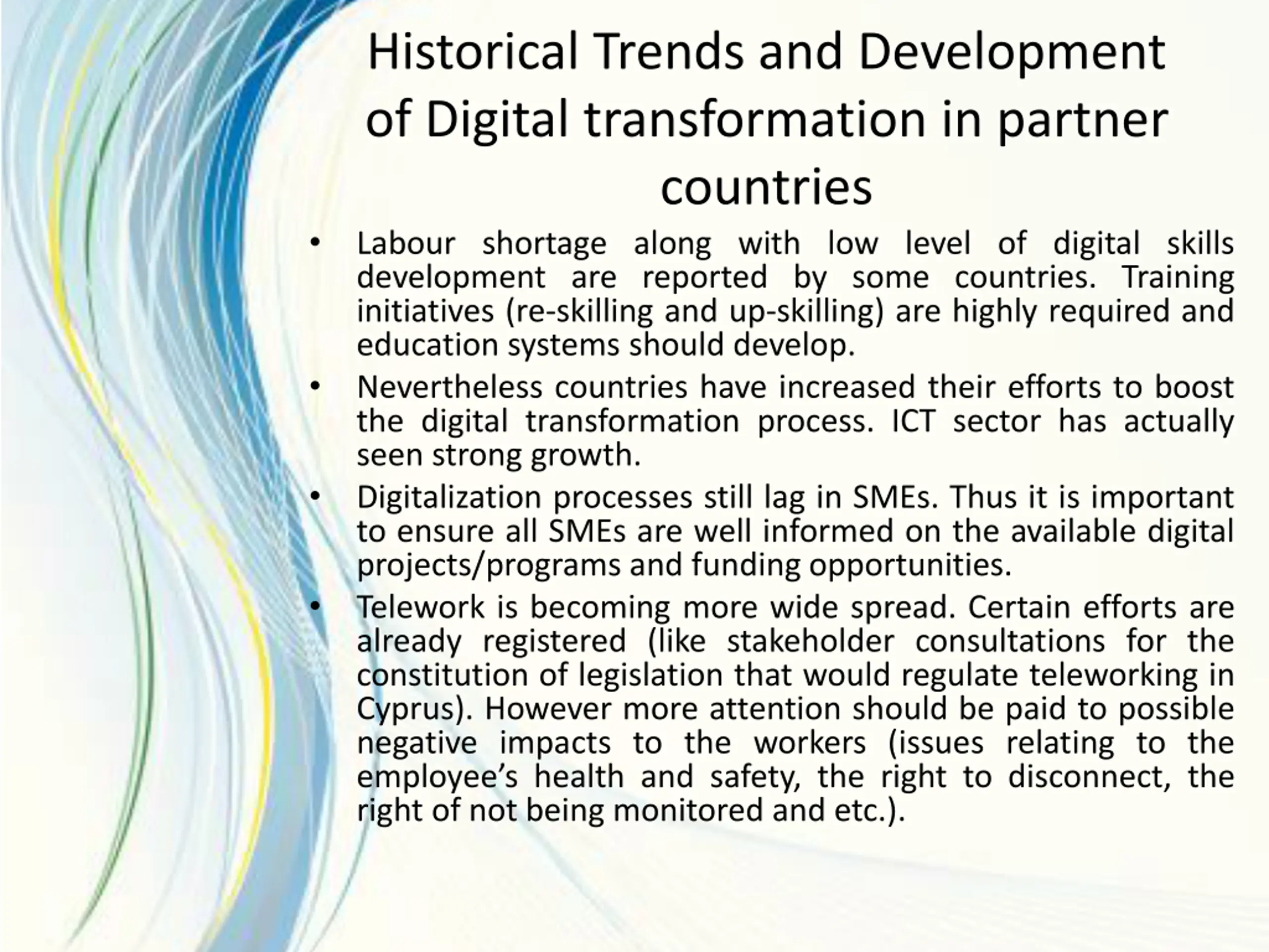 Historical Trends and Development of Digital transformation in partner countries Labour shortage along with low level of digital skills development are reported by some countries. Training initiatives (re-skilling and up-skilling) are highly required and education systems should develop. Nevertheless countries have increased their efforts to boost the digital transformation process. ICT sector has actually seen strong growth. Digitalization processes still lag in SMEs. Thus it is important to ensure all SMEs are well informed on the available digital projects/programs and funding opportunities. Telework is becoming more wide spread. Certain efforts are already registered (like stakeholder consultations for the constitution of legislation that would regulate teleworking in Cyprus). However more attention should be paid to possible negative impacts to the workers (issues relating to the employee s health and safety, the right to disconnect, the right of not being monitored and etc.).