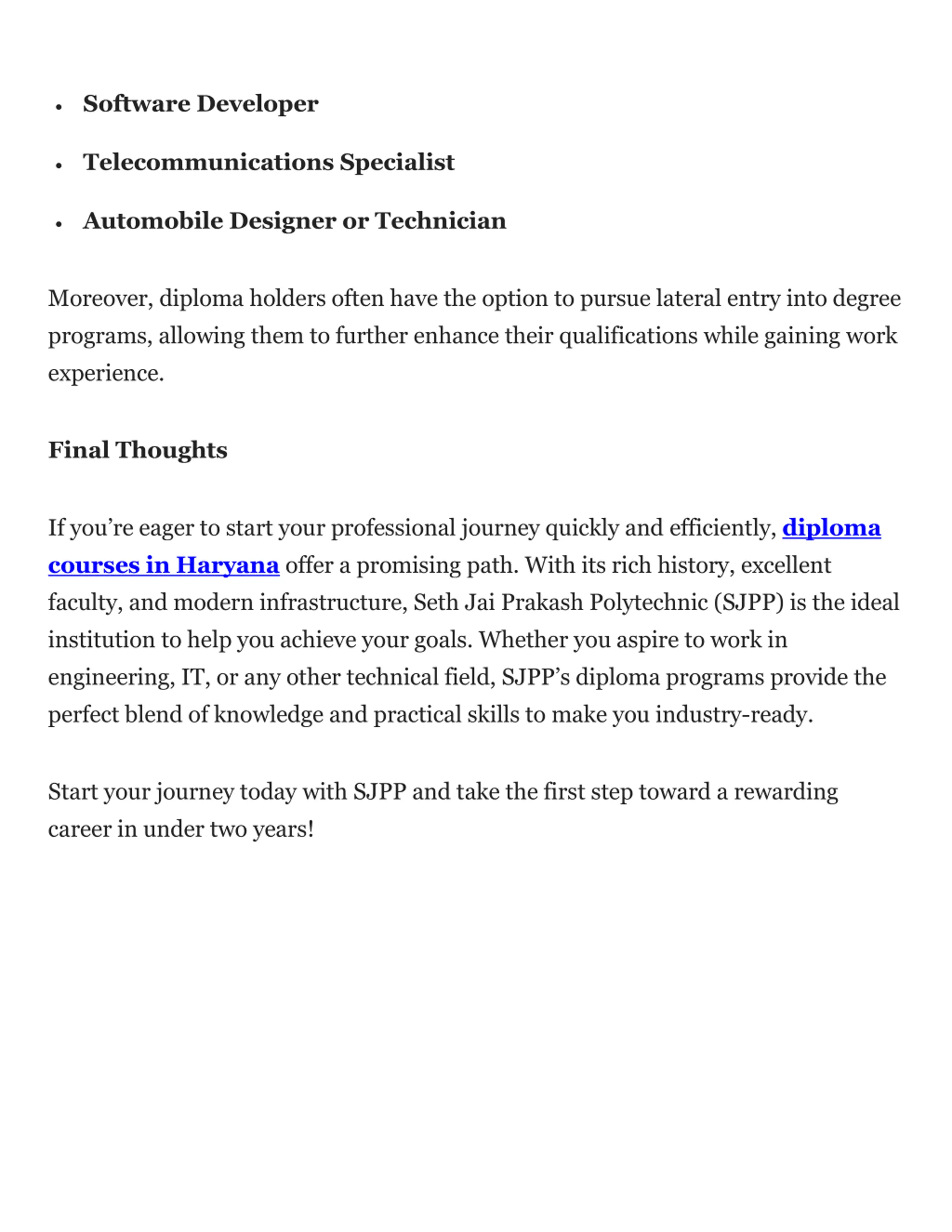 Software Developer Telecommunications Specialist Automobile Designer or Technician Moreover, diploma holders often have the option to pursue lateral entry into degree programs, allowing them to further enhance their qualifications while gaining work experience. Final Thoughts If you re eager to start your professional journey quickly and efficiently, diploma courses in Haryana offer a promising path. With its rich history, excellent faculty, and modern infrastructure, Seth Jai Prakash Polytechnic (SJPP) is the ideal institution to help you achieve your goals. Whether you aspire to work in engineering, IT, or any other technical field, SJPP s diploma programs provide the perfect blend of knowledge and practical skills to make you industry-ready. Start your journey today with SJPP and take the first step toward a rewarding career in under two years!
