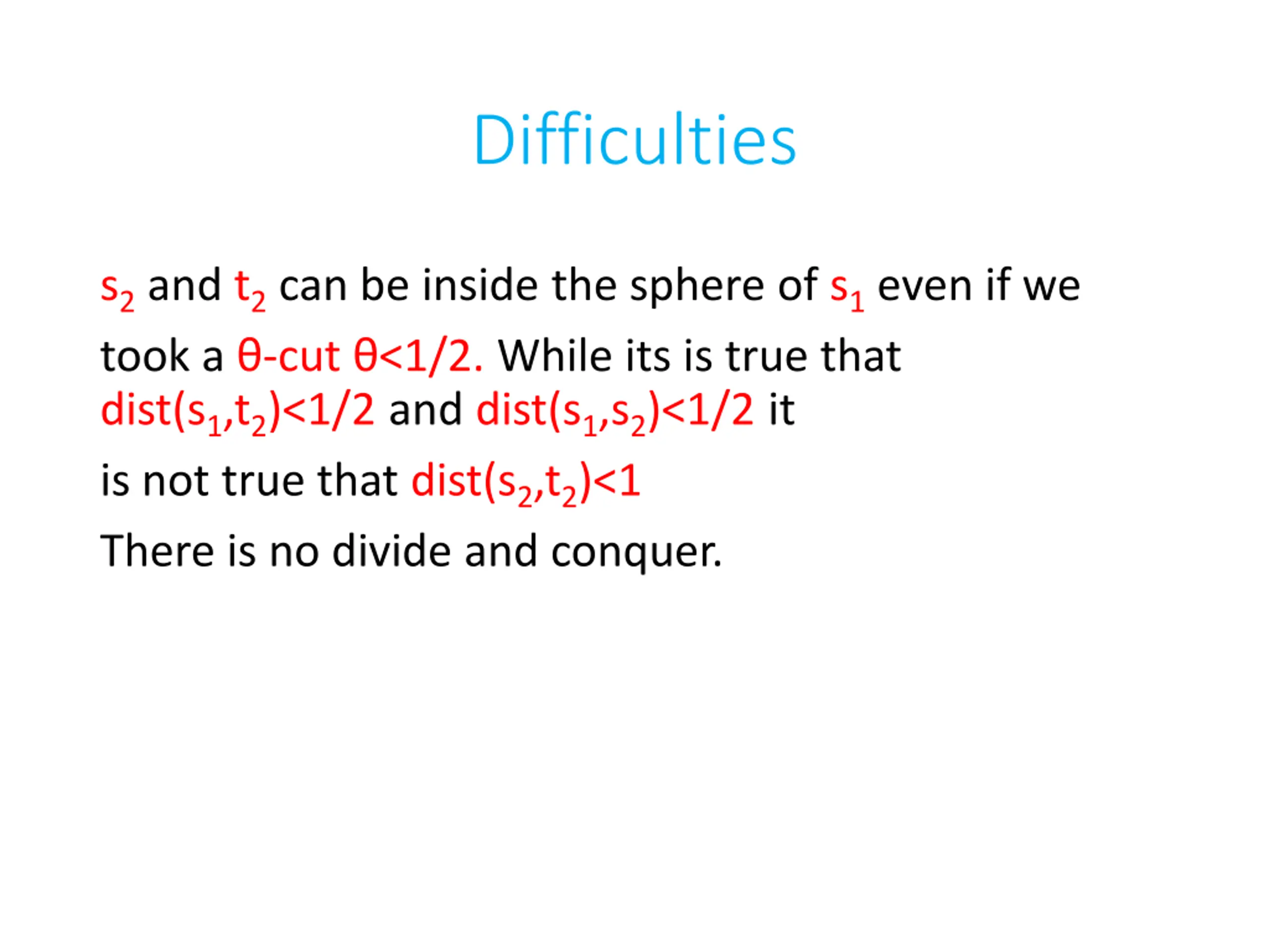 Difficulties s2and t2can be inside the sphere of s1even if we took a -cut <1/2. While its is true that dist(s1,t2)<1/2 and dist(s1,s2)<1/2 it is not true that dist(s2,t2)<1 There is no divide and conquer.