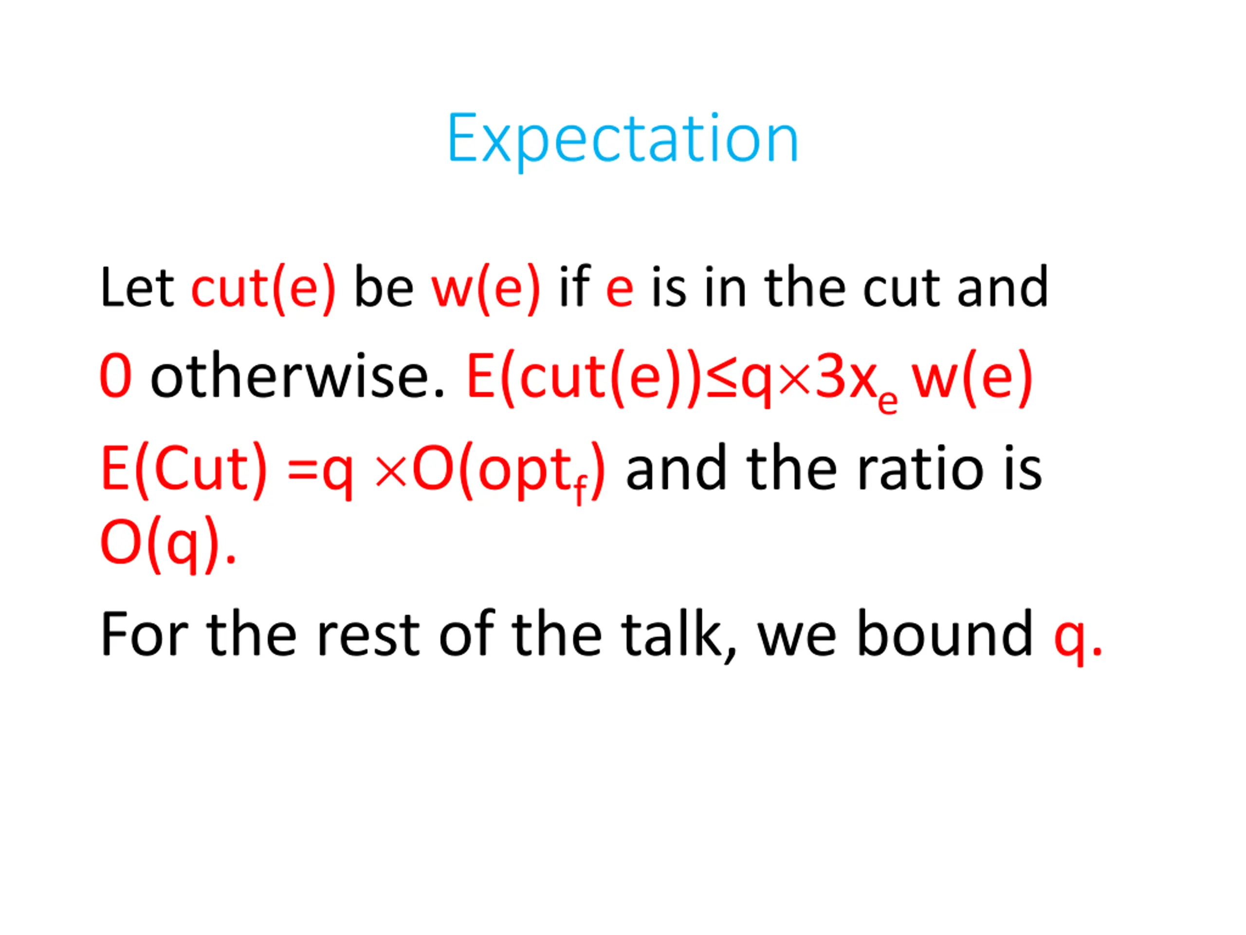 Expectation Let cut(e) be w(e) if e is in the cut and 0 otherwise. E(cut(e)) q 3xe w(e) E(Cut) =q O(optf) and the ratio is O(q). For the rest of the talk, we bound q.