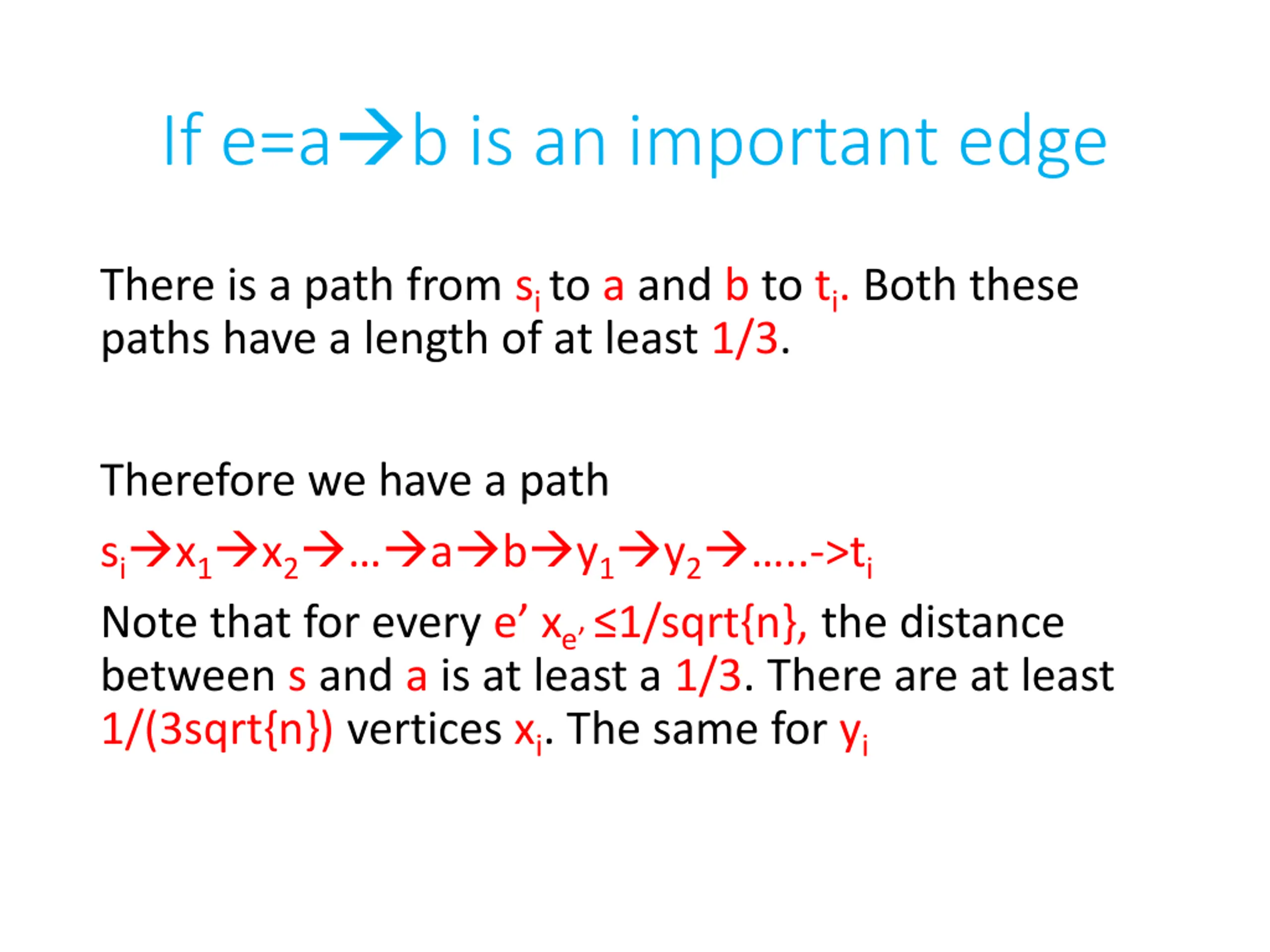 If e=ab is an important edge There is a path from sito a and b to ti. Both these paths have a length of at least 1/3. Therefore we have a path si x1 x2 a b y1 y2 ..->ti Note that for every e xe 1/sqrt{n}, the distance between s and a is at least a 1/3. There are at least 1/(3sqrt{n}) vertices xi. The same for yi