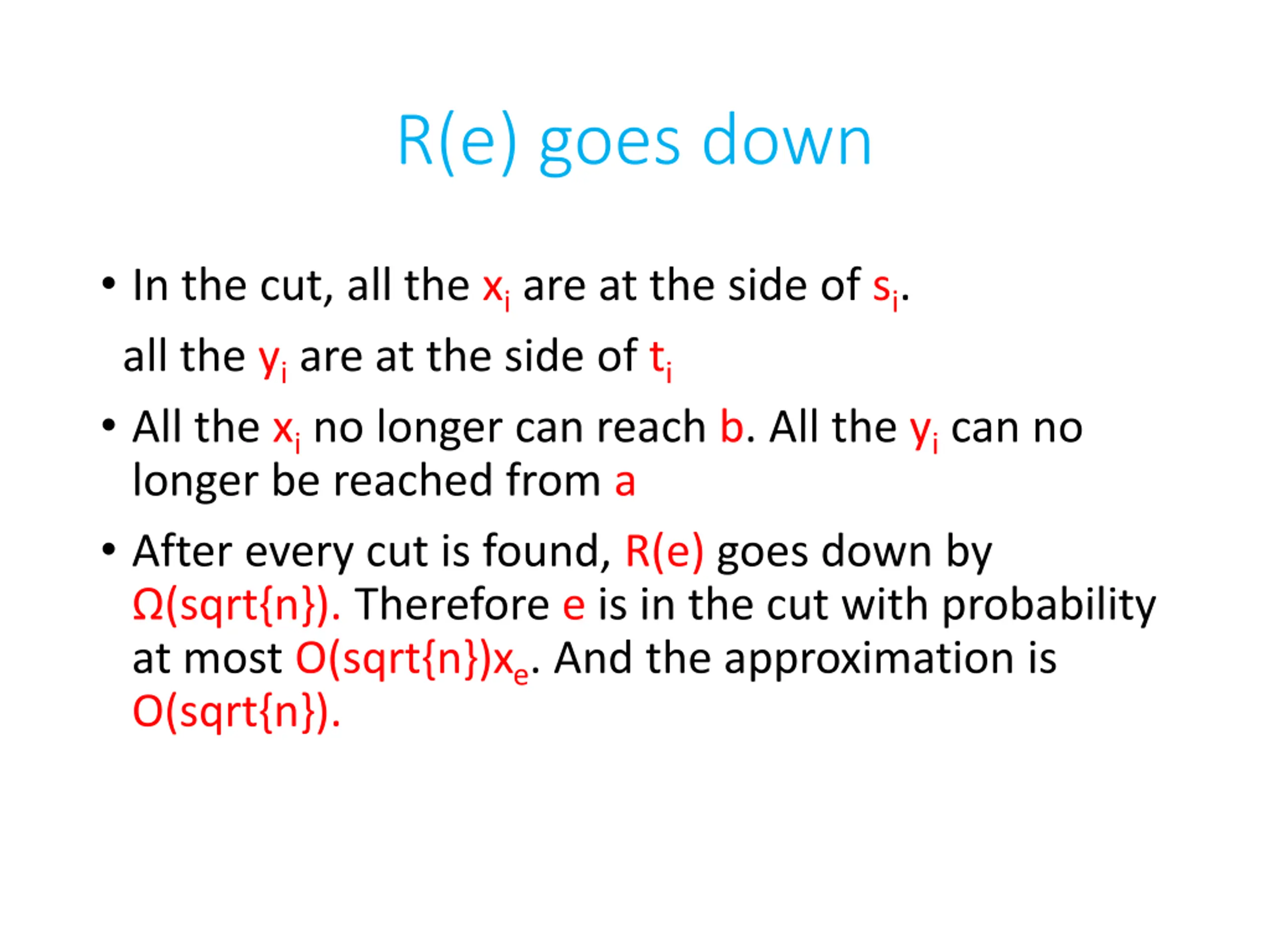 R(e) goes down In the cut, all the xiare at the side of si. all the yiare at the side of ti All the xino longer can reach b. All the yican no longer be reached from a After every cut is found, R(e) goes down by (sqrt{n}). Therefore e is in the cut with probability at most O(sqrt{n})xe. And the approximation is O(sqrt{n}).