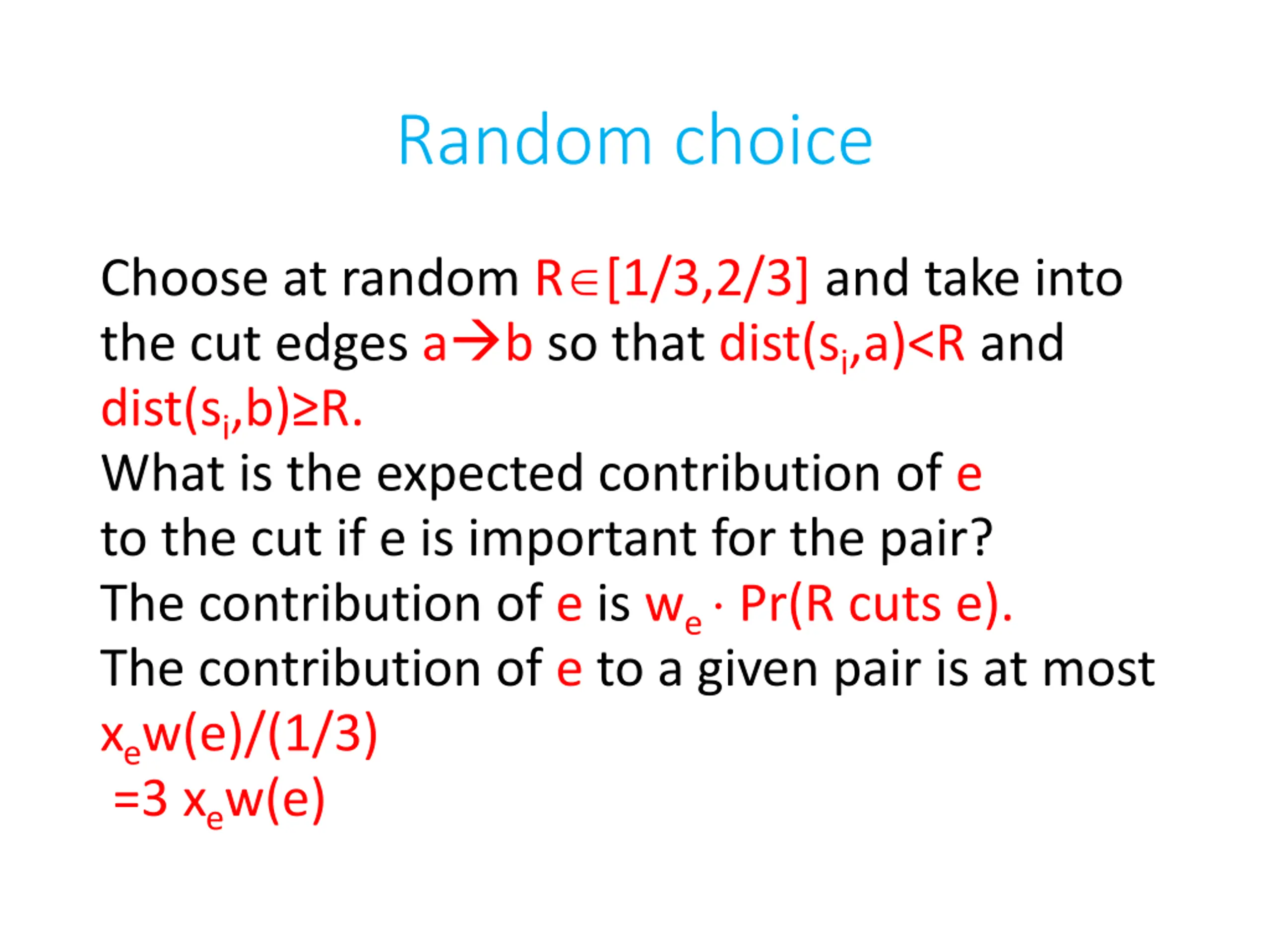 Random choice Choose at random R [1/3,2/3] and take into the cut edges a b so that dist(si,a)<R and dist(si,b) R. What is the expected contribution of e to the cut if e is important for the pair? The contribution of e is we Pr(R cuts e). The contribution of e to a given pair is at most xew(e)/(1/3) =3 xew(e)