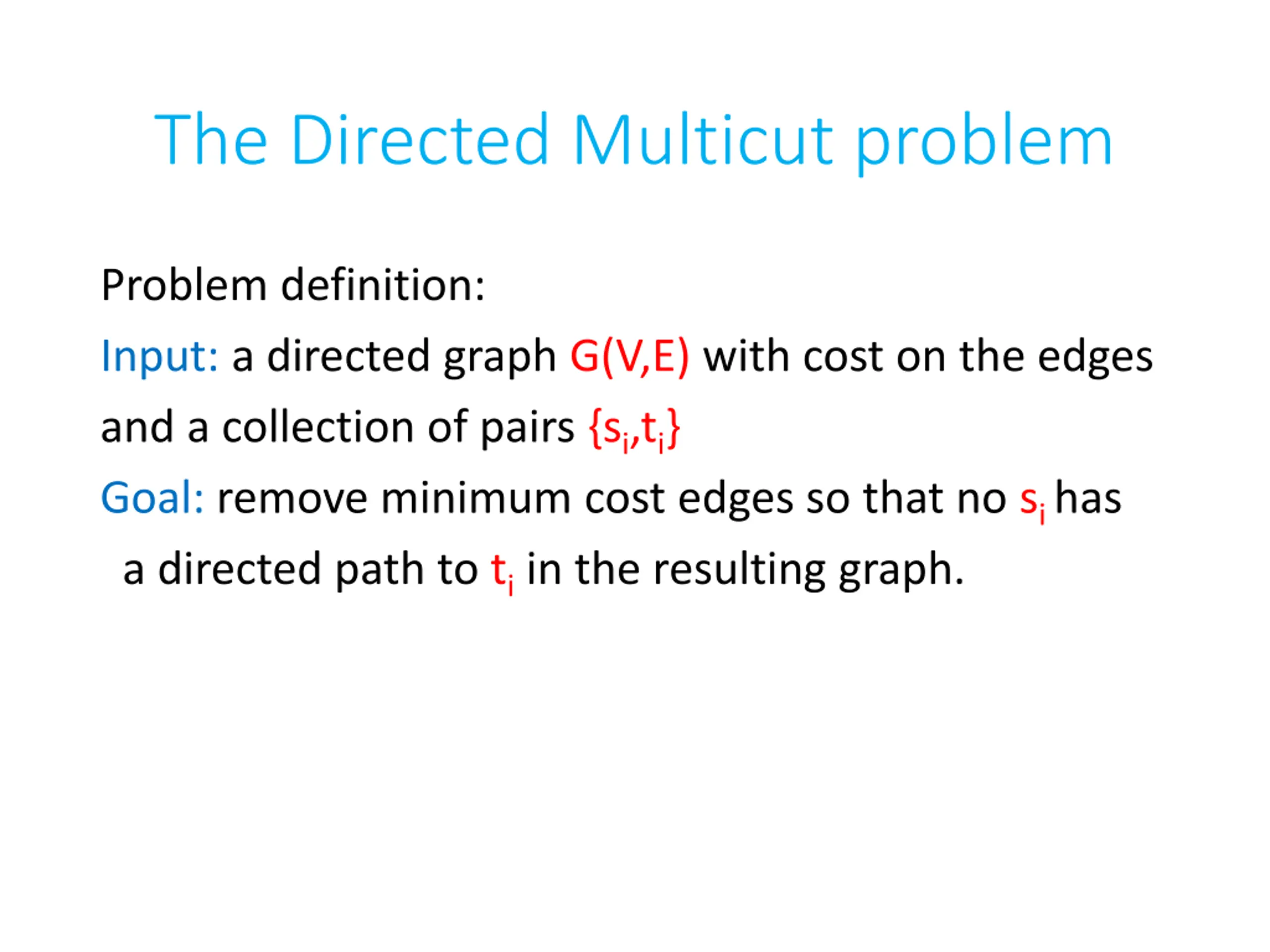 The Directed Multicut problem Problem definition: Input: a directed graph G(V,E) with cost on the edges and a collection of pairs {si,ti} Goal: remove minimum cost edges so that no sihas a directed path to tiin the resulting graph.