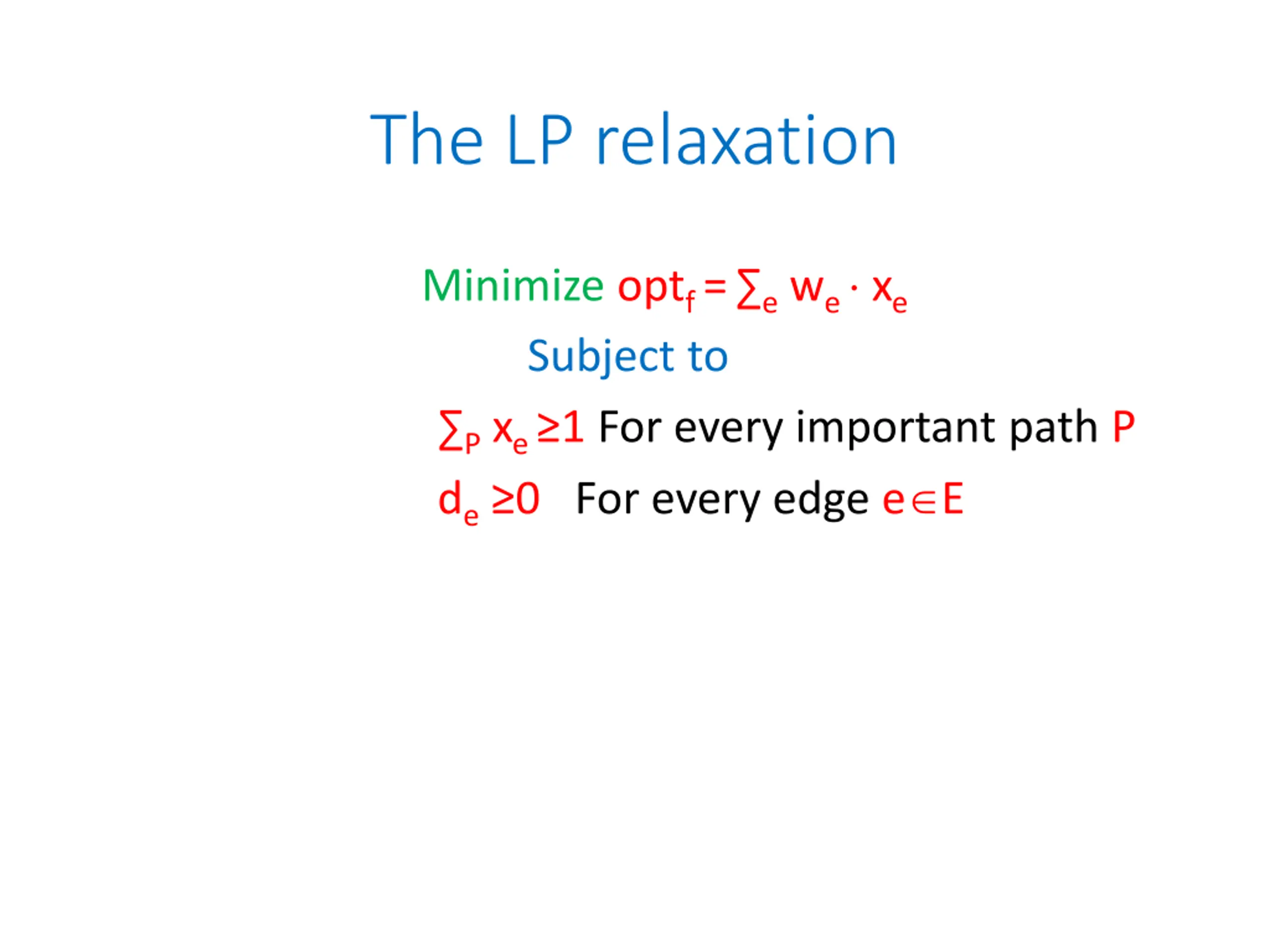 The LP relaxation Minimize optf= ewe xe Subject to Pxe 1 For every important path P de 0 For every edge e E