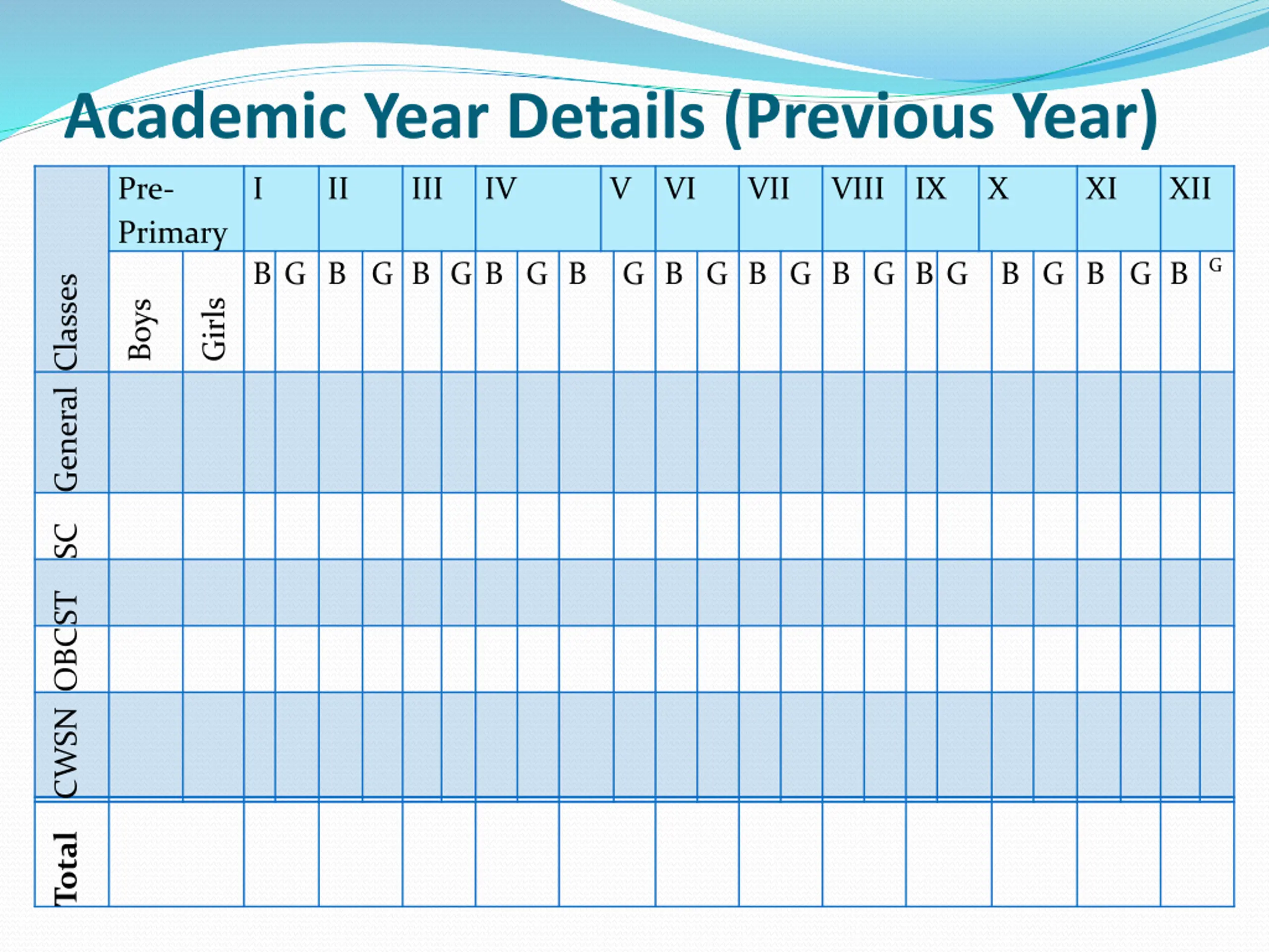 Academic Year Details (Previous Year) Pre- Primary I II III IV V VI VII VIII IX X XI XII G B G B G B G B G B G B G B G B G B G B G B G B Classes General Girls Boys SC ST OBC CWSN Total
