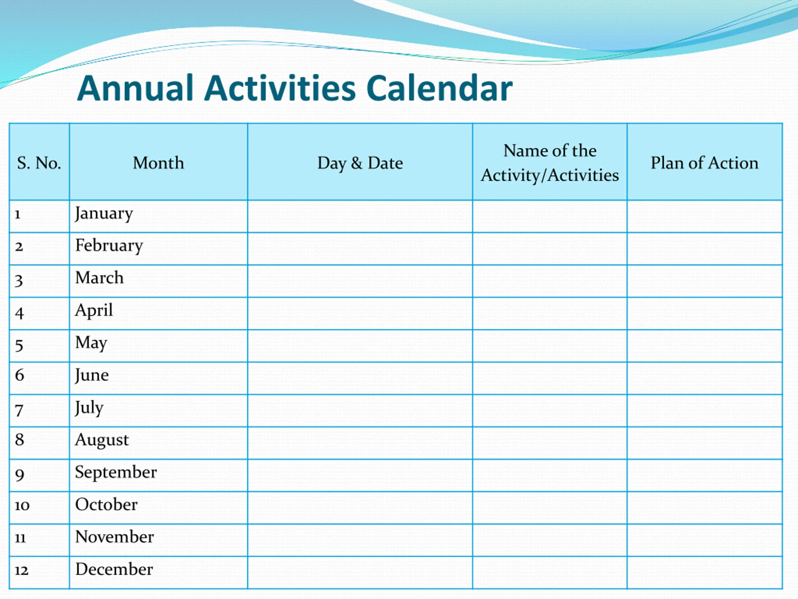 Annual Activities Calendar Name of the Activity/Activities S. No. Month Day & Date Plan of Action 1 January 2 February 3 March 4 April 5 May 6 June 7 July 8 August 9 September 10 October 11 November 12 December
