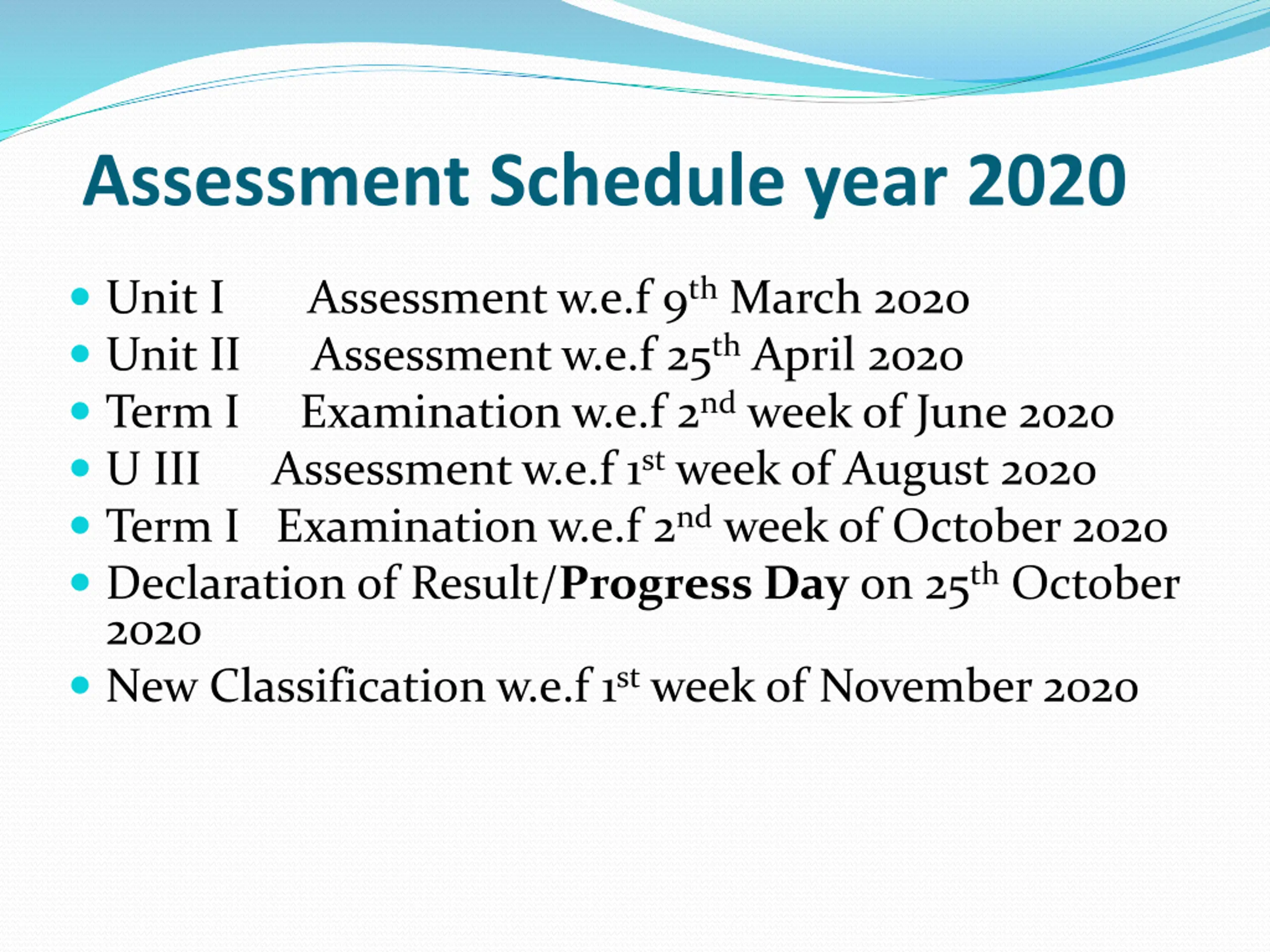 Assessment Schedule year 2020 Assessment w.e.f 9thMarch 2020 Assessment w.e.f 25thApril 2020 Unit I Unit II Term I Examination w.e.f 2ndweek of June 2020 U III Assessment w.e.f 1stweek of August 2020 Term I Examination w.e.f 2ndweek of October 2020 Declaration of Result/Progress Day on 25thOctober 2020 New Classification w.e.f 1stweek of November 2020