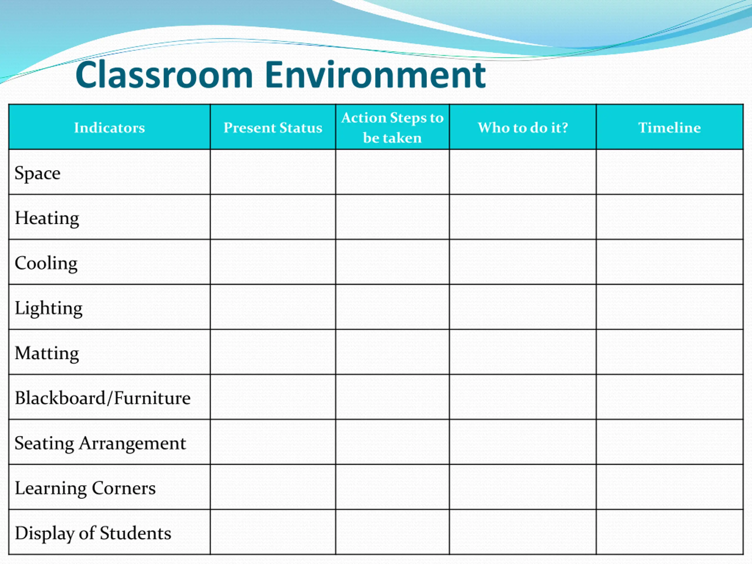 Classroom Environment Action Steps to be taken Indicators Present Status Who to do it? Timeline Space Heating Cooling Lighting Matting Blackboard/Furniture Seating Arrangement Learning Corners Display of Students