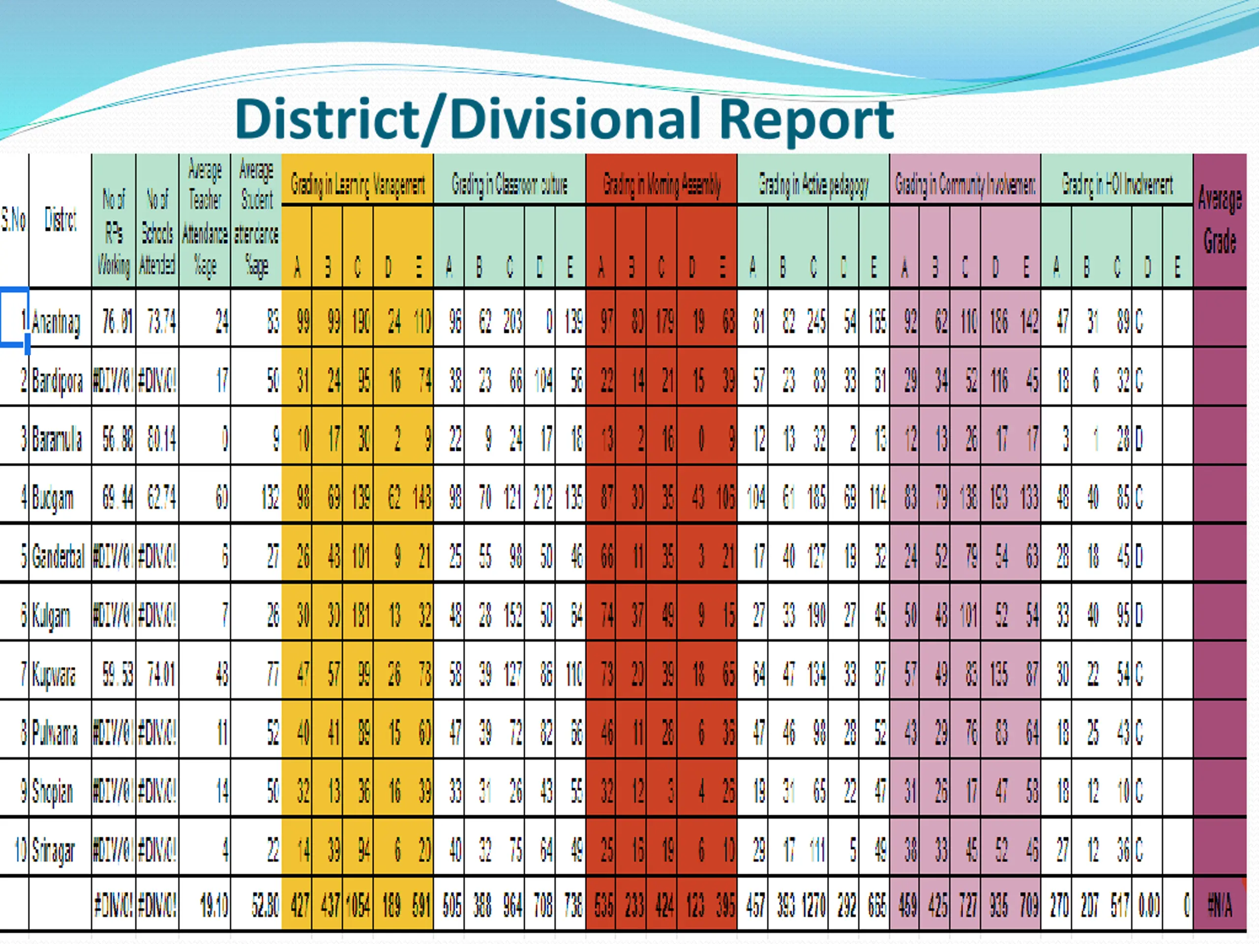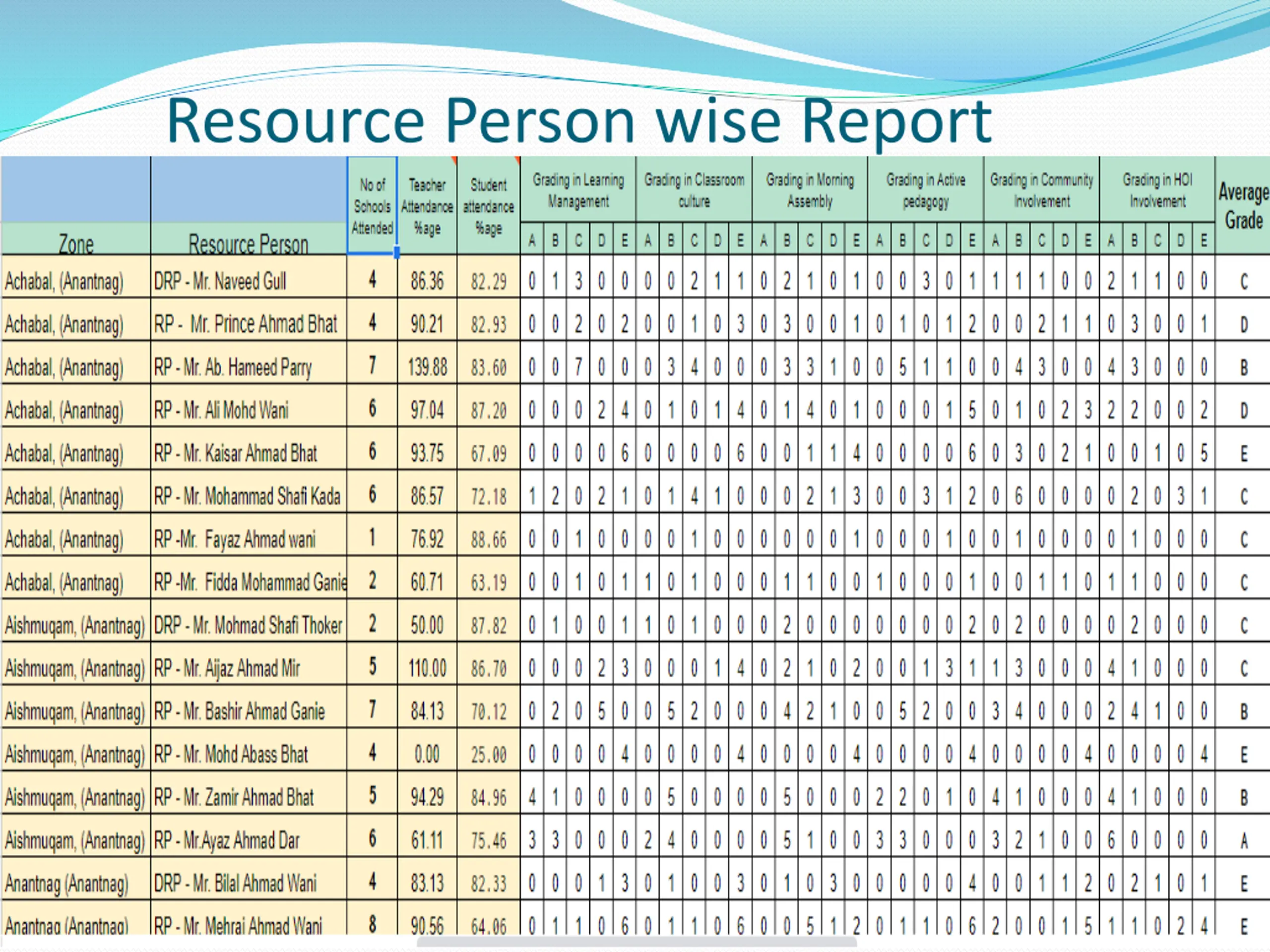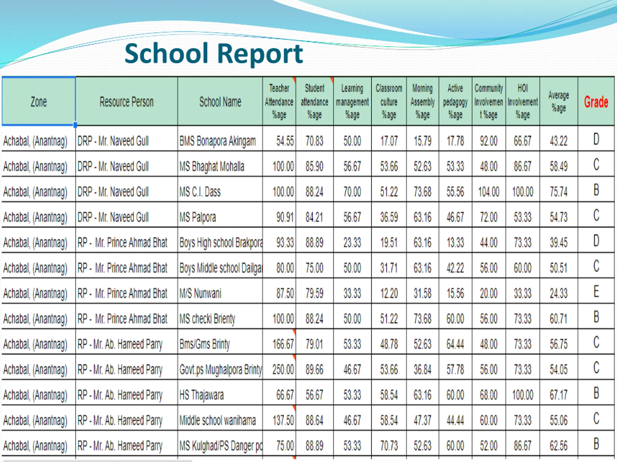 Online Academic Monitoring & School Tracking system using Google Docs through a network of DRGs, ZRPs and CRPs-Learning Level Assessments (Elementary) As mentioned in Academic Performance Index (SPI) Engagement ,School Activities and Learning Levels as per Learning Outcomes Assessment & School Processes Tracker (Assessment Tool) has been formulated. Team DRGs ,ZRPs & CRPs visit elementary schools and apply this AssessmentTool in these Schools. The School Processes are punched online on Mobile Phone in App/Google Doc in assessmenttool . We get Real-time capture of School Performance Index a snapshot of District-wise, Zone-wise and School wise performance of Children & School. Planner, School which reflects Children ,an online Academic