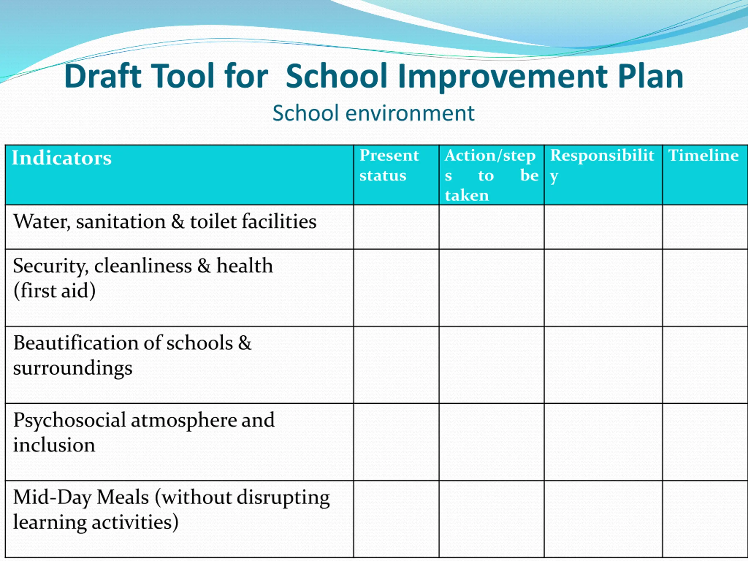 Draft Tool for School Improvement Plan School environment Present status Action/step s to taken Responsibilit y Timeline Indicators be Water, sanitation & toilet facilities Security, cleanliness & health (first aid) Beautification of schools & surroundings Psychosocial atmosphere and inclusion Mid-Day Meals (without disrupting learning activities)