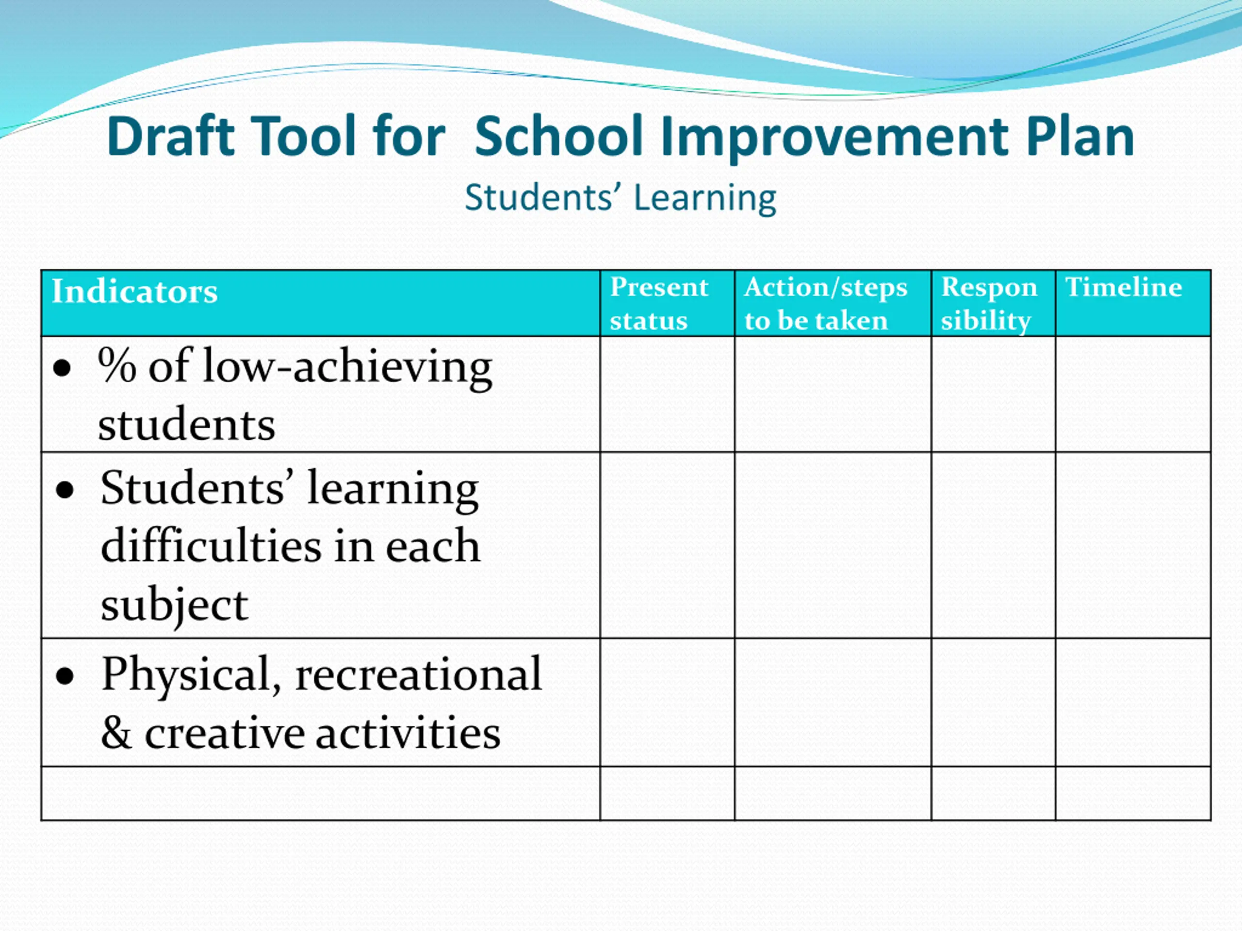 Draft Tool for School Improvement Plan Students Learning Present status Action/steps to be taken Respon sibility Timeline Indicators % of low-achieving students Students learning difficulties in each subject Physical, recreational & creative activities