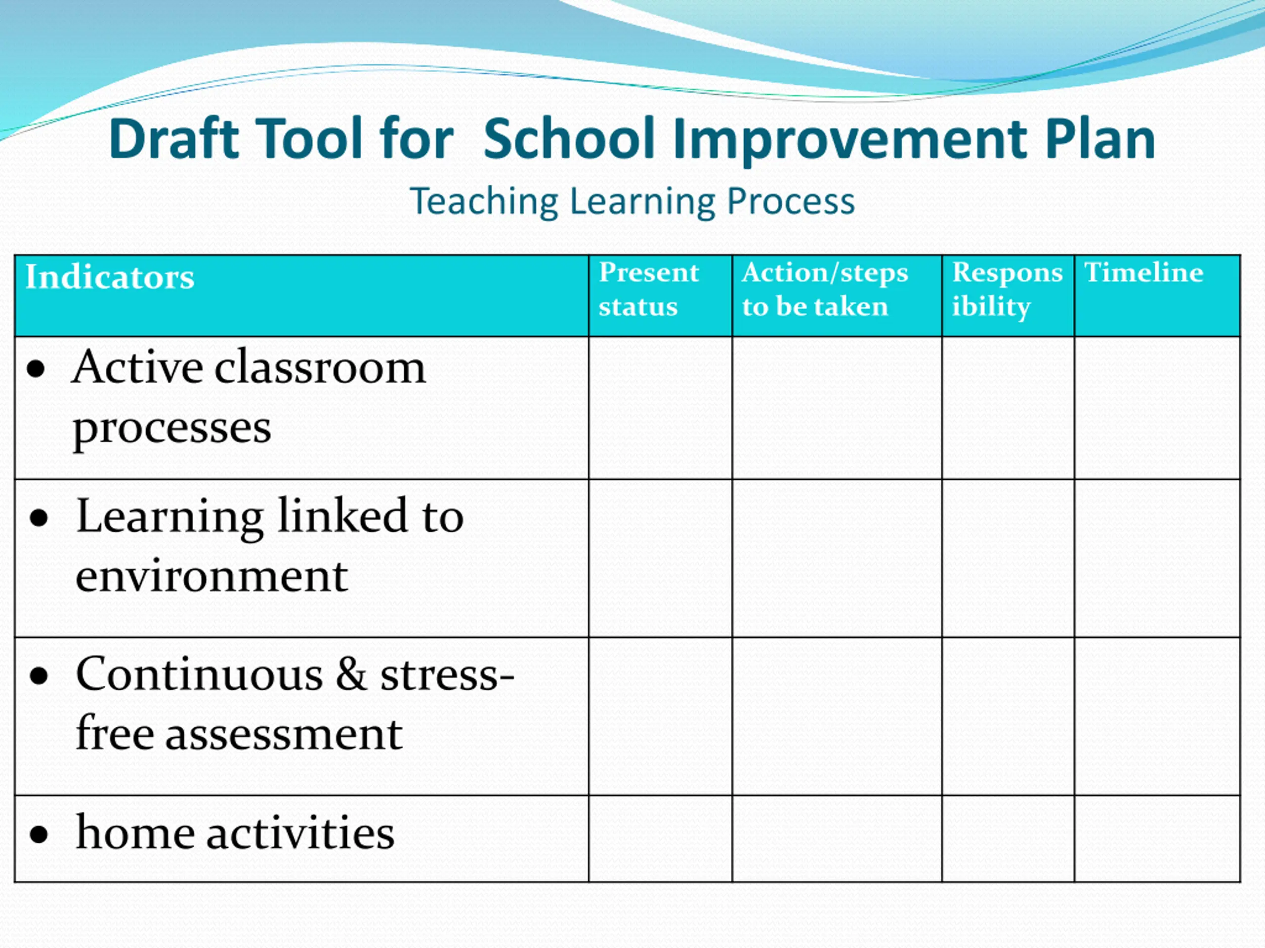Draft Tool for School Improvement Plan Teaching Learning Process Present status Action/steps to be taken Respons ibility Timeline Indicators Active classroom processes Learning linked to environment Continuous & stress- free assessment home activities