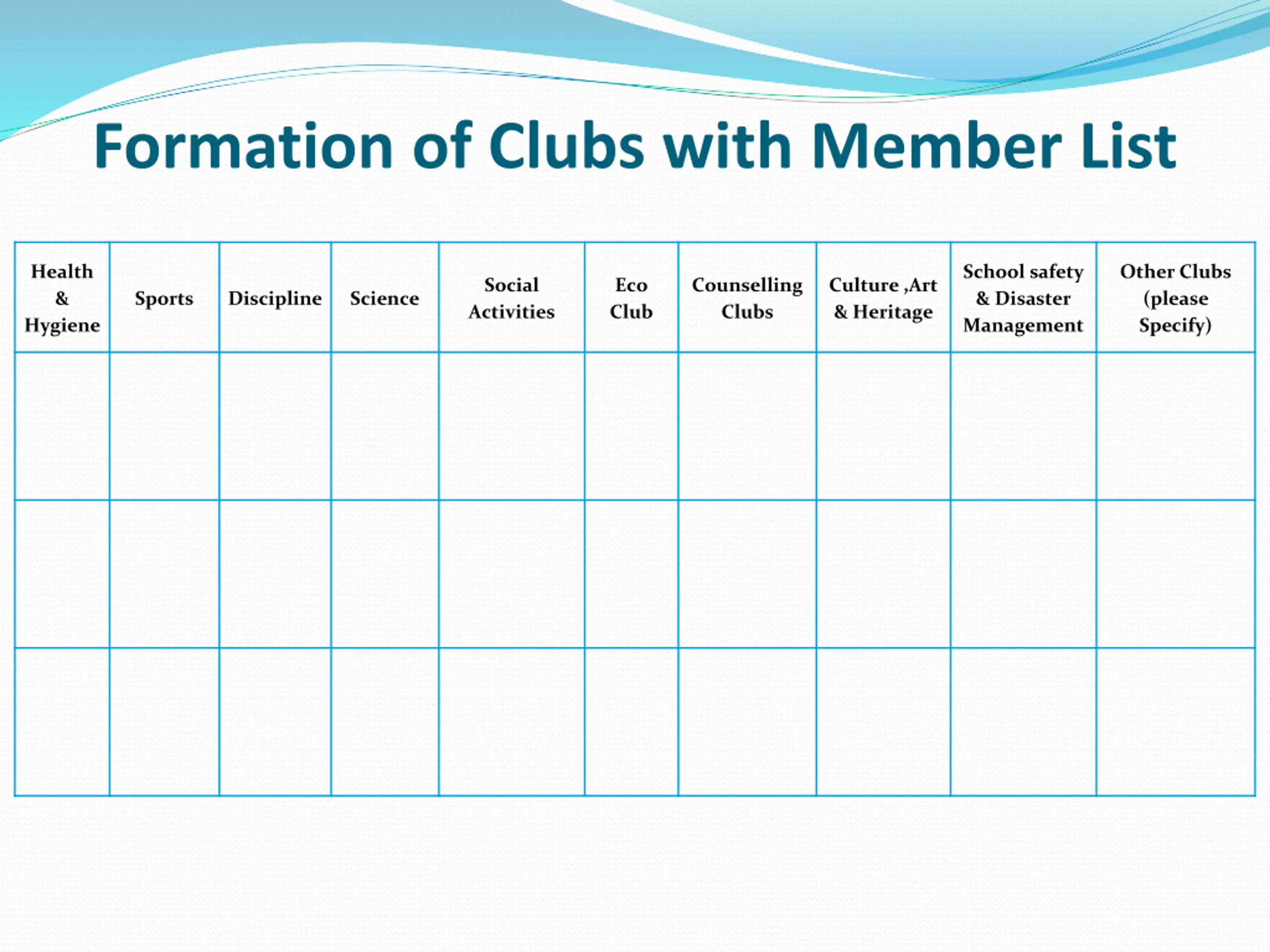 Formation of Clubs with Member List Health & Hygiene School safety & Disaster Management Other Clubs (please Specify) Social Activities Eco Club Counselling Clubs Culture ,Art & Heritage Sports Discipline Science