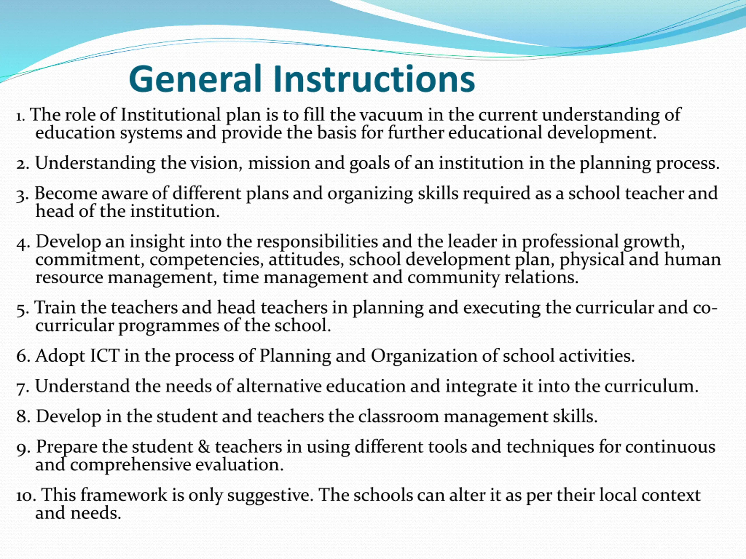 General Instructions 1. The role of Institutional plan is to fill the vacuum in the current understanding of education systems and provide the basis for further educational development. 2. Understanding the vision, mission and goals of an institution in the planning process. 3. Become aware of different plans and organizing skills required as a school teacher and head of the institution. 4. Develop an insight into the responsibilities and the leader in professional growth, commitment, competencies, attitudes, school development plan, physical and human resource management, time management and community relations. 5. Train the teachers and head teachers in planning and executing the curricular and co- curricular programmes of the school. 6. Adopt ICT in the process of Planning and Organization of school activities. 7. Understand the needs of alternative education and integrate it into the curriculum. 8. Develop in the student and teachers the classroom management skills. 9. Prepare the student & teachers in using different tools and techniques for continuous and comprehensive evaluation. 10. This framework is only suggestive. The schools can alter it as per their local context and needs.