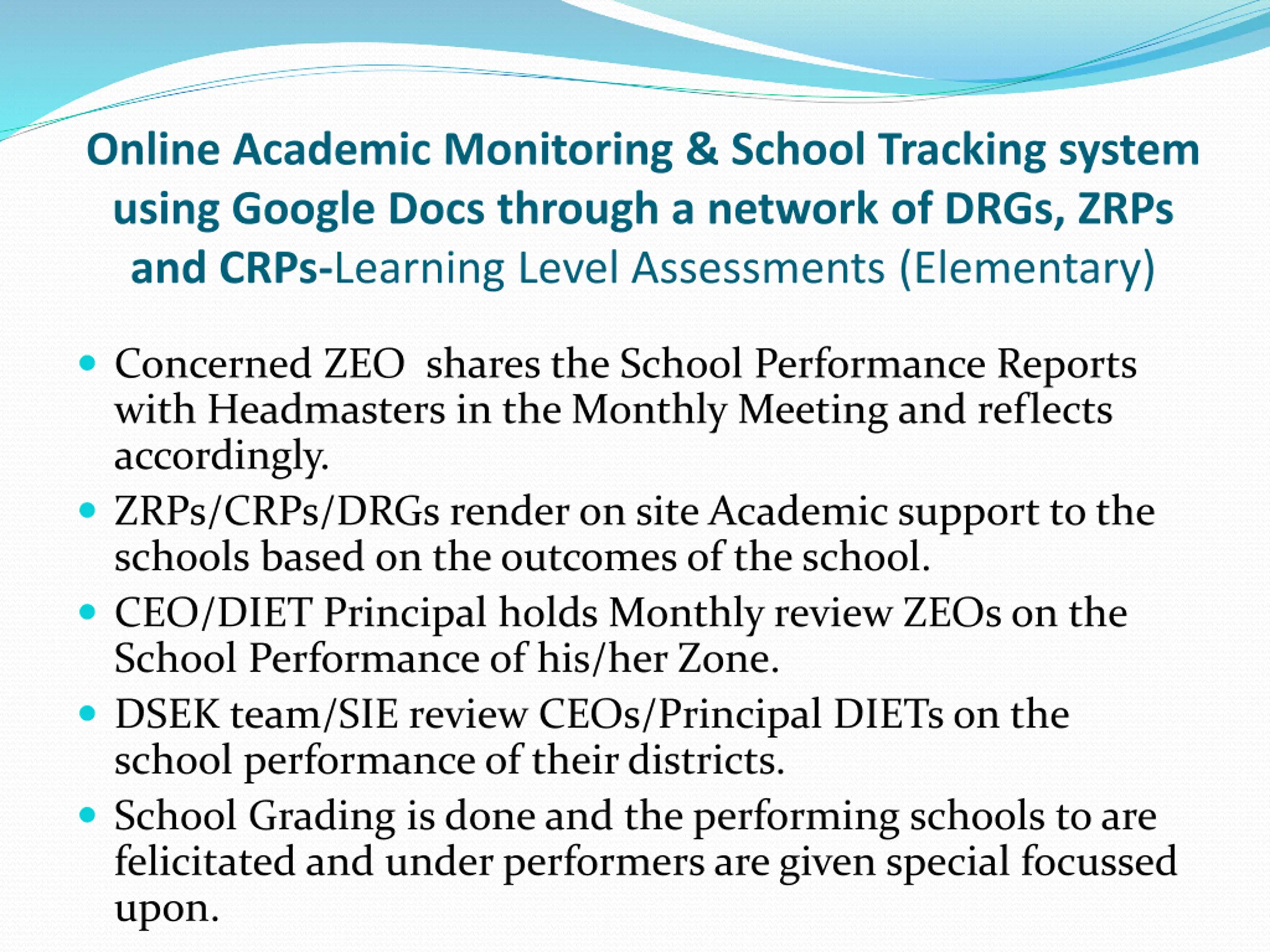 Online Academic Monitoring & School Tracking system using Google Docs through a network of DRGs, ZRPs and CRPs-Learning Level Assessments (Elementary) Concerned ZEO shares the School Performance Reports with Headmasters in the Monthly Meeting and reflects accordingly. ZRPs/CRPs/DRGs render on site Academic support to the schools based on the outcomes of the school. CEO/DIET Principal holds Monthly review ZEOs on the School Performance of his/her Zone. DSEK team/SIE review CEOs/Principal DIETs on the school performance of their districts. School Grading is done and the performing schools to are felicitated and under performers are given special focussed upon.