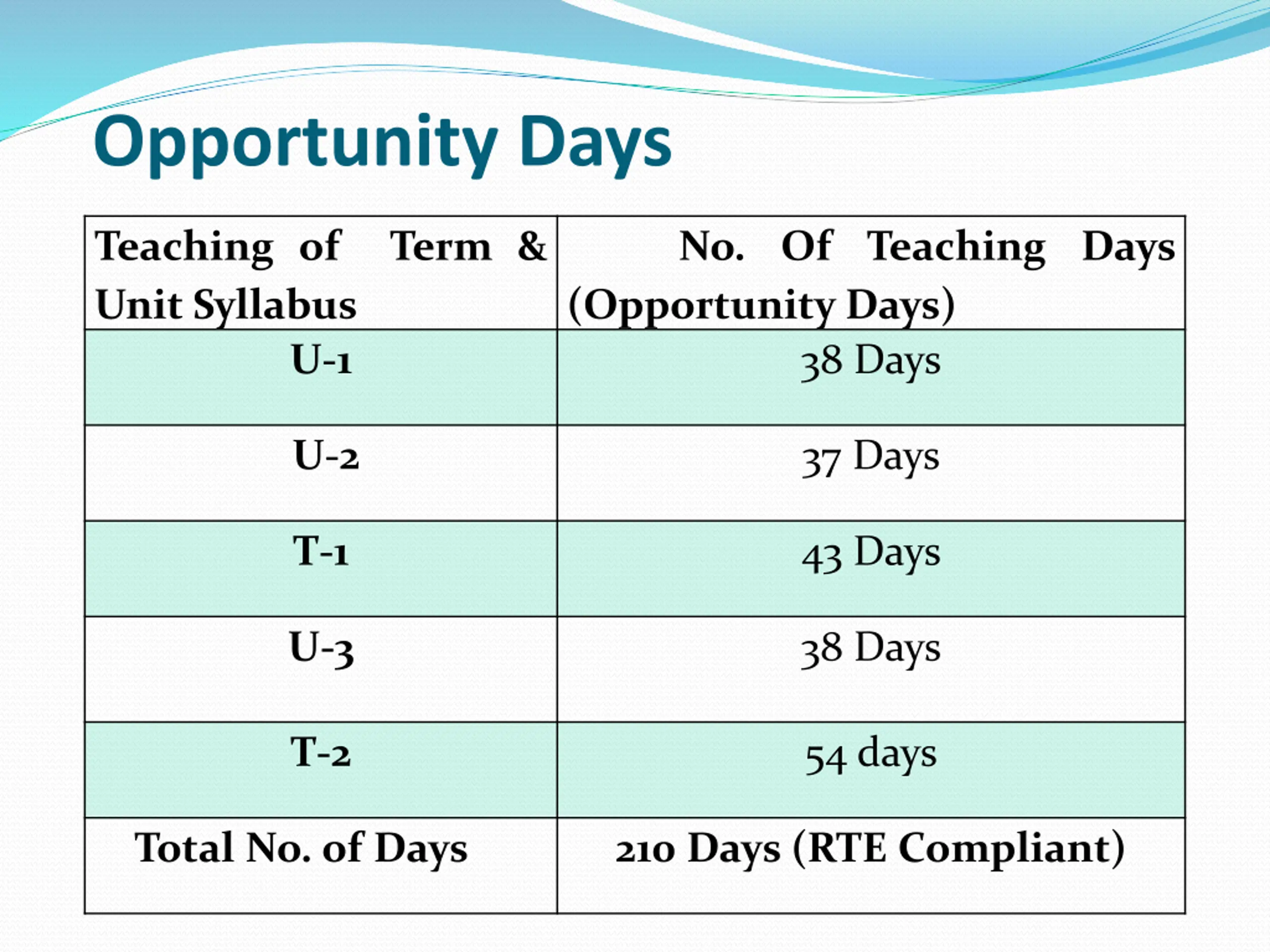 Opportunity Days Teaching of Unit Syllabus Term & No. Of Teaching Days (Opportunity Days) 38 Days U-1 U-2 37 Days T-1 43 Days U-3 38 Days T-2 54 days Total No. of Days 210 Days (RTE Compliant)