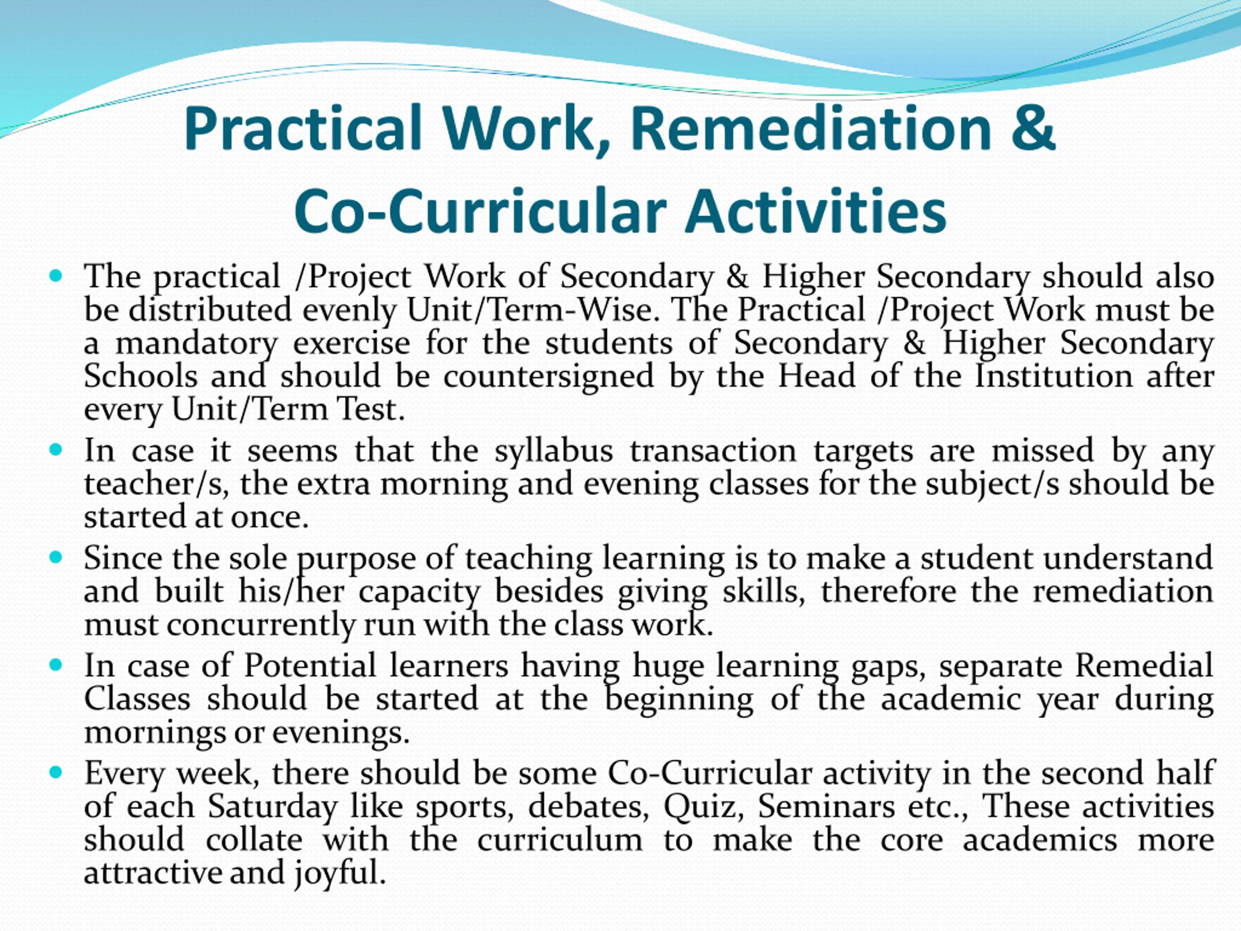 Practical Work, Remediation & Co-Curricular Activities The practical /Project Work of Secondary & Higher Secondary should also be distributed evenly Unit/Term-Wise. The Practical /Project Work must be a mandatory exercise for the students of Secondary & Higher Secondary Schools and should be countersigned by the Head of the Institution after every Unit/Term Test. In case it seems that the syllabus transaction targets are missed by any teacher/s, the extra morning and evening classes for the subject/s should be started atonce. Since the sole purpose of teaching learning is to make a student understand and built his/her capacity besides giving skills, therefore the remediation mustconcurrentlyrun with theclass work. In case of Potential learners having huge learning gaps, separate Remedial Classes should be started at the beginning of the academic year during morningsorevenings. Every week, there should be some Co-Curricular activity in the second half of each Saturday like sports, debates, Quiz, Seminars etc., These activities should collate with the curriculum to make the core academics more attractiveand joyful.