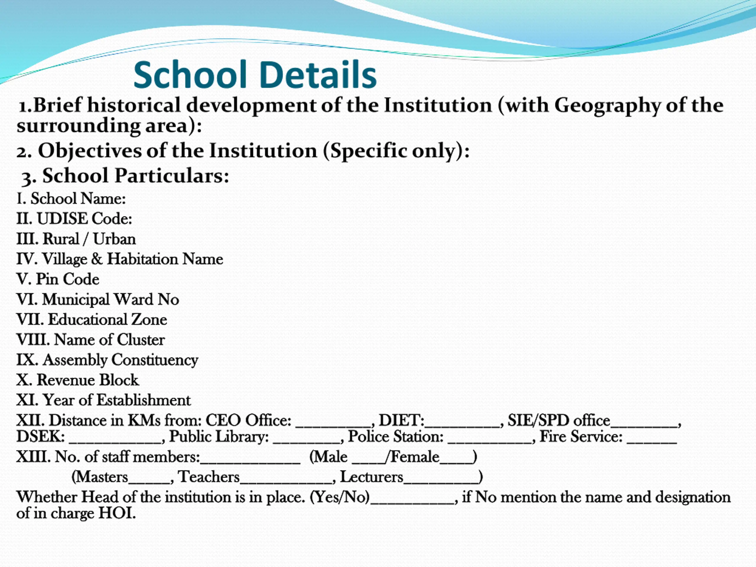 School Details 1.Brief historical development of the Institution (with Geography of the surrounding area): 2. Objectives of the Institution (Specific only): 3. School Particulars: I. School Name . School Name: : II. UDISE Code: II. UDISE Code: III. Rural / Urban III. Rural / Urban IV. Village & Habitation IV. Village & Habitation Name Name V. Pin V. Pin Code Code VI. Municipal Ward VI. Municipal Ward No No VII. Educational VII. Educational Zone Zone VIII. Name of VIII. Name of Cluster Cluster IX. Assembly IX. Assembly Constituency Constituency X. Revenue X. Revenue Block Block XI. Year of XI. Year of Establishment Establishment XII. Distance in KMs from: CEO Office: _________, DIET:_________, SIE/SPD office________, XII. Distance in KMs from: CEO Office: _________, DIET:_________, SIE/SPD office________, DSEK: ___________, Public Library: ________, Police Station: __________, Fire Service: ______ DSEK: ___________, Public Library: ________, Police Station: __________, Fire Service: ______ XIII. No. of staff members:____________ (Male ____/Female____) XIII. No. of staff members:____________ (Male ____/Female____) (Masters_____, Teachers___________, Lecturers_________) (Masters_____, Teachers___________, Lecturers_________) Whether Head of the institution is in place. (Yes/No)__________, if No mention the name and designation Whether Head of the institution is in place. (Yes/No)__________, if No mention the name and designation of in charge HOI. of in charge HOI.