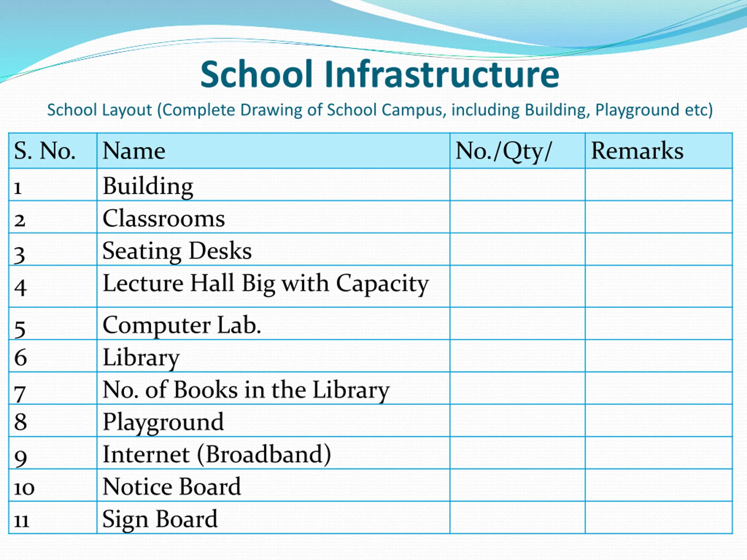 School Infrastructure School Layout (Complete Drawing of School Campus, including Building, Playground etc) S. No. Name 1 2 3 4 No./Qty/ Remarks Building Classrooms Seating Desks Lecture Hall Big with Capacity 5 6 7 8 9 10 11 Computer Lab. Library No. of Books in the Library Playground Internet (Broadband) Notice Board Sign Board