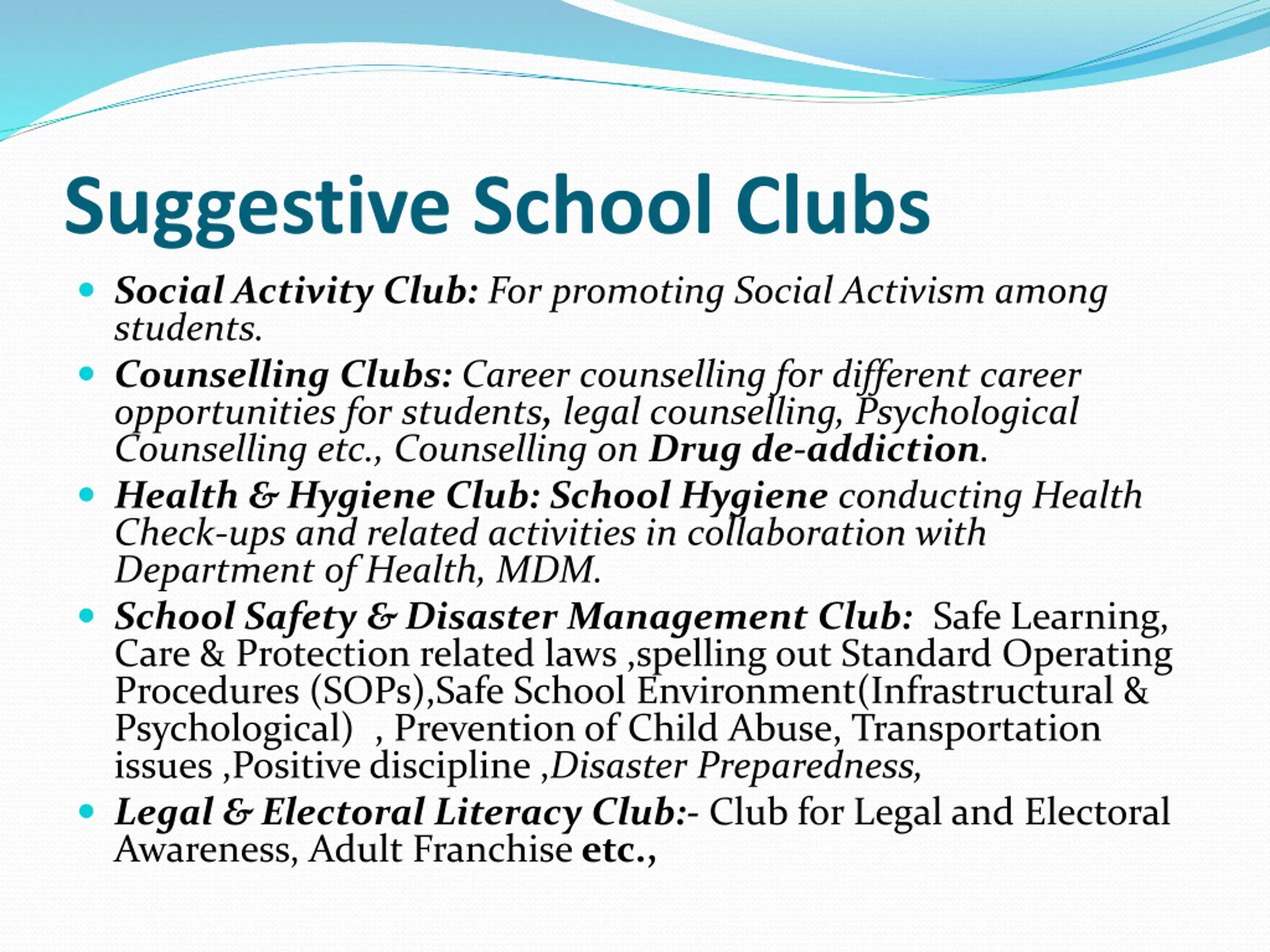 Suggestive School Clubs Social Activity Club: For promoting Social Activism among students. Counselling Clubs: Career counselling for different career opportunities for students, legal counselling, Psychological Counselling etc., Counselling on Drug de-addiction. Health & Hygiene Club: School Hygiene conducting Health Check-ups and related activities in collaboration with Department of Health, MDM. School Safety & Disaster Management Club: Safe Learning, Care & Protection related laws ,spelling out Standard Operating Procedures (SOPs),Safe School Environment(Infrastructural & Psychological) , Prevention of Child Abuse, Transportation issues ,Positive discipline ,Disaster Preparedness, Legal & Electoral Literacy Club:- Club for Legal and Electoral Awareness, Adult Franchise etc.,