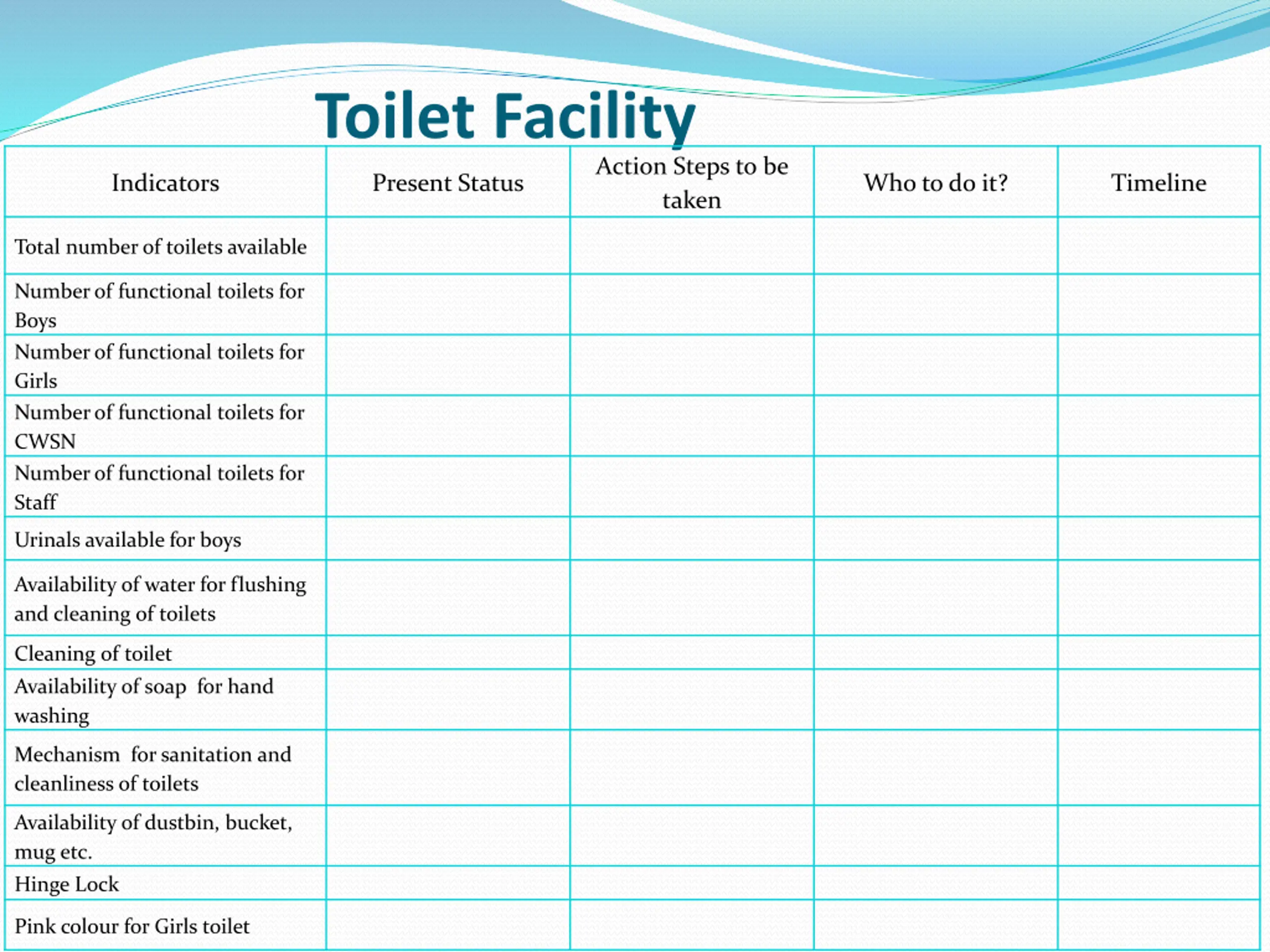 Toilet Facility Action Steps to be taken Indicators Present Status Who to do it? Timeline Total number of toilets available Number of functional toilets for Boys Number of functional toilets for Girls Number of functional toilets for CWSN Number of functional toilets for Staff Urinals available for boys Availability of water for flushing and cleaning of toilets Cleaning of toilet Availability of soap for hand washing Mechanism for sanitation and cleanliness of toilets Availability of dustbin, bucket, mug etc. Hinge Lock Pink colour for Girls toilet