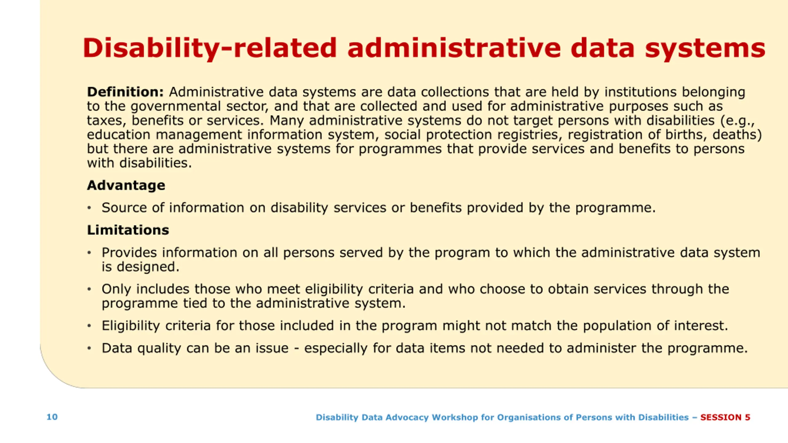 General administrative data systems Definition: Administrative data systems are data collections that are held by institutions belonging to the governmental sector , and that are collected and used for administrative purposes such as taxes, benefits or services. Administrative data is data derived from an administrative system. The source of data is the participant s administrative records rather than direct contact with the participant, although information included in administrative records can be obtained directly from participants. Advantages: Available source of information for disaggregation if items identifying the population with disabilities is included in the data system Limitations: Provides information on all persons served by the programme for which the administrative data is kept. But only those who meet eligibility criteria and, for many systems, who choose to obtain services through the programme will be included The disability indicator used by the programme may not produce high-quality data or address the aspects of the disability of interest. Data quality can be an issue for all items but especially for data items not needed to administer the programme. 9 Disability Data Advocacy Workshop for Organisations of Persons with Disabilities SESSION 5