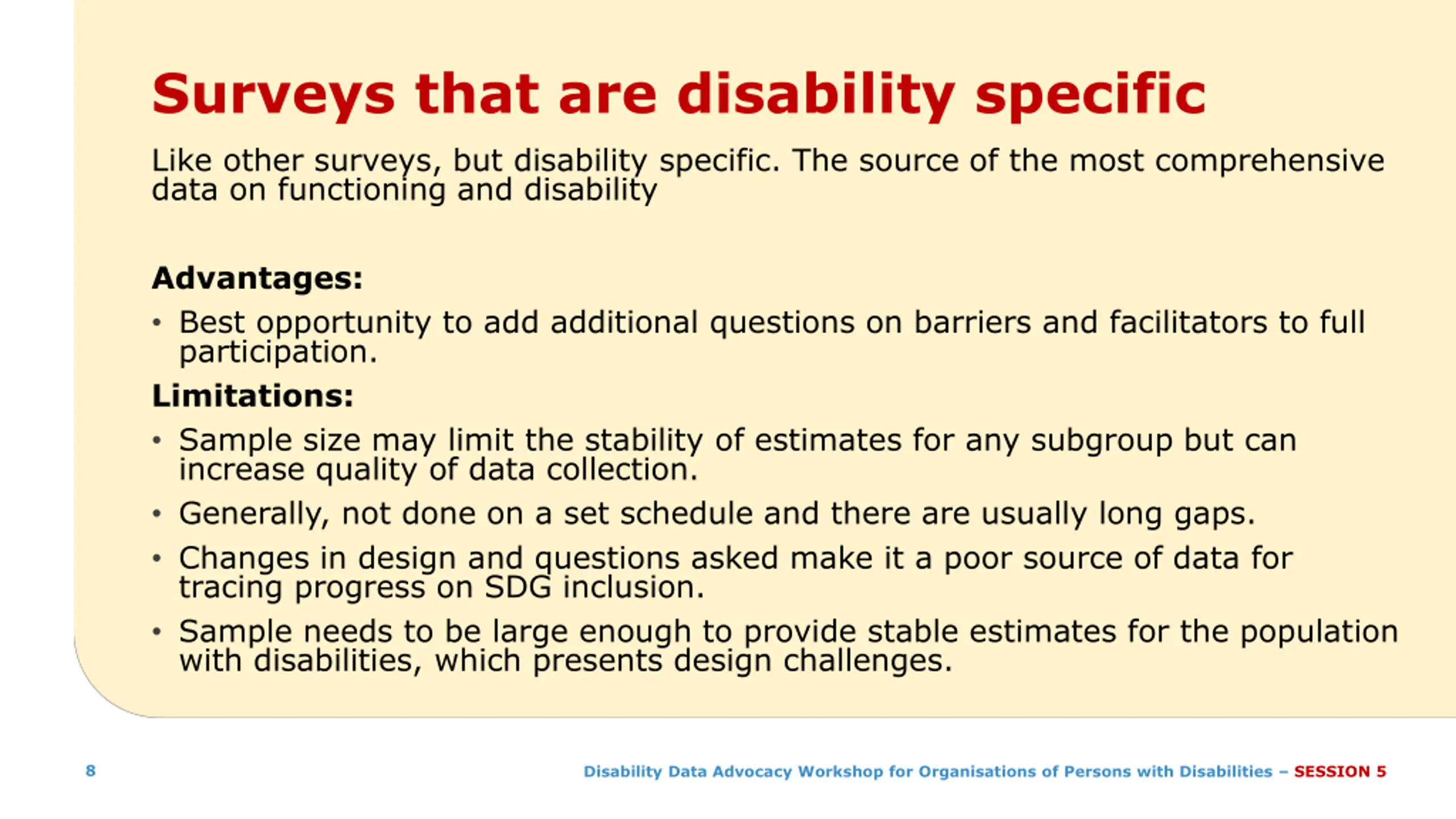 Surveys that are disability specific Like other surveys, but disability specific. The source of the most comprehensive data on functioning and disability Advantages: Best opportunity to add additional questions on barriers and facilitators to full participation. Limitations: Sample size may limit the stability of estimates for any subgroup but can increase quality of data collection. Generally, not done on a set schedule and there are usually long gaps. Changes in design and questions asked make it a poor source of data for tracing progress on SDG inclusion. Sample needs to be large enough to provide stable estimates for the population with disabilities, which presents design challenges. 8 Disability Data Advocacy Workshop for Organisations of Persons with Disabilities SESSION 5