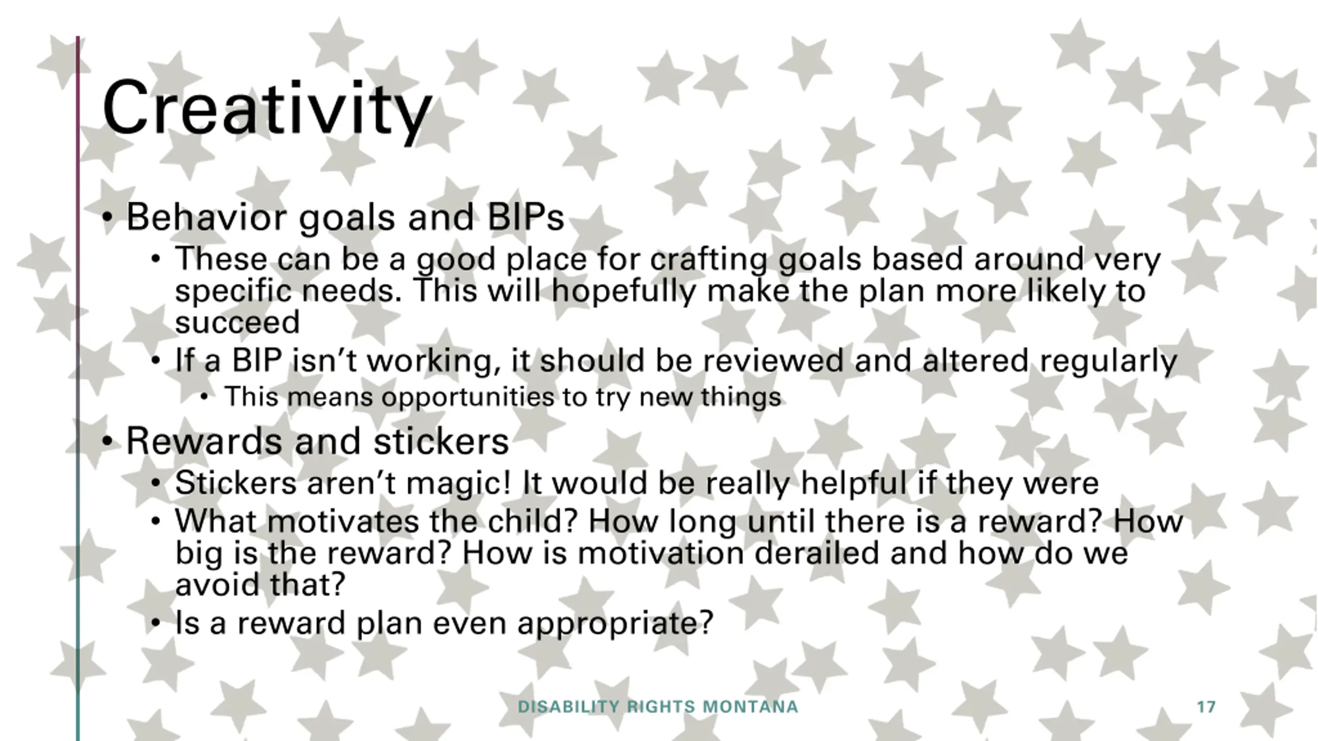 Creativity Behavior goals and BIPs These can be a good place for crafting goals based around very specific needs. This will hopefully make the plan more likely to succeed If a BIP isn t working, it should be reviewed and altered regularly This means opportunities to try new things Rewards and stickers Stickers aren t magic! It would be really helpful if they were What motivates the child? How long until there is a reward? How big is the reward? How is motivation derailed and how do we avoid that? Is a reward plan even appropriate? DISABILITY RIGHTS MONTANA 17