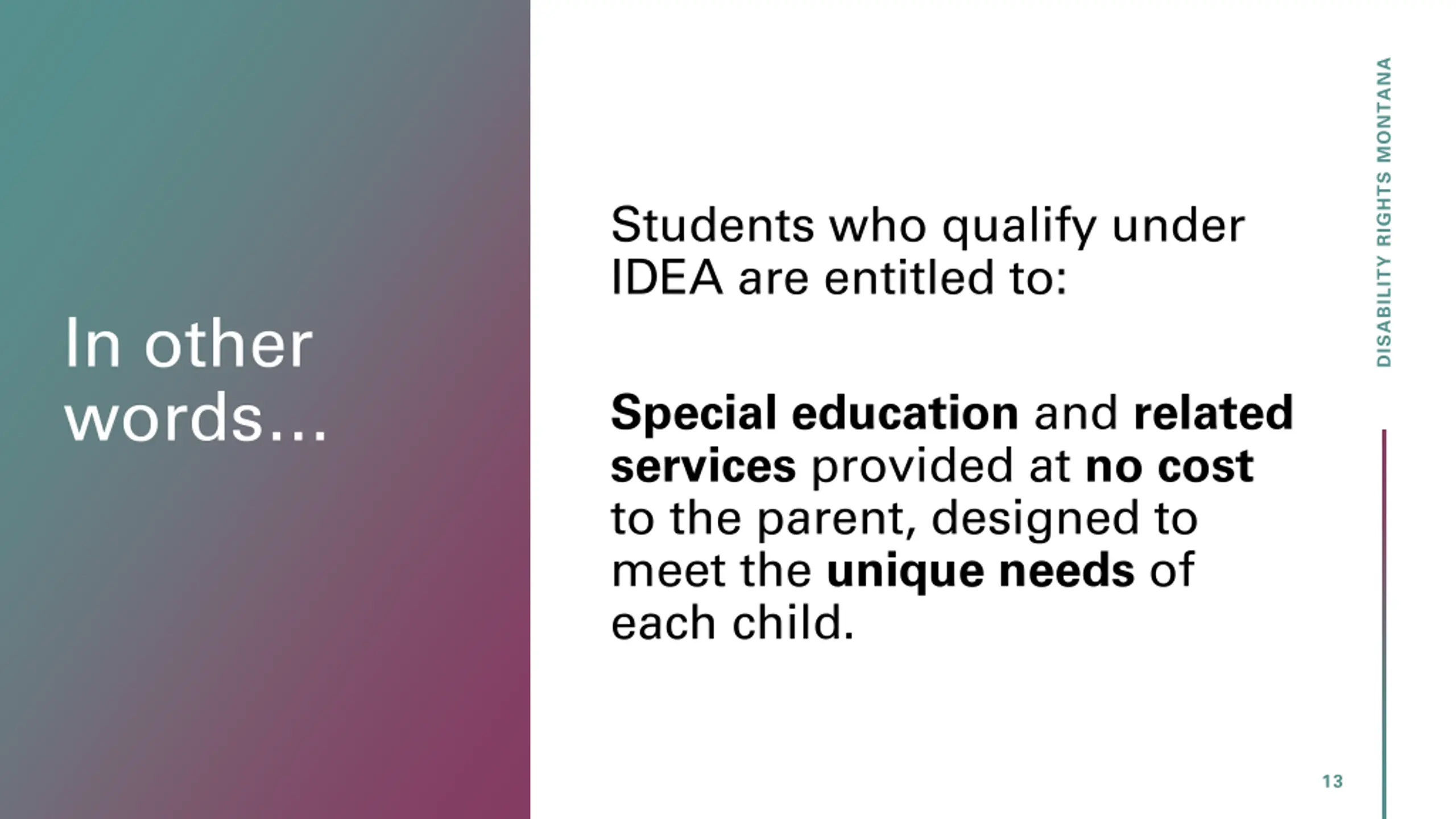 DISABILITY RIGHTS MONTANA Students who qualify under IDEA are entitled to: In other words Special education and related services provided at no cost to the parent, designed to meet the unique needs of each child. 13