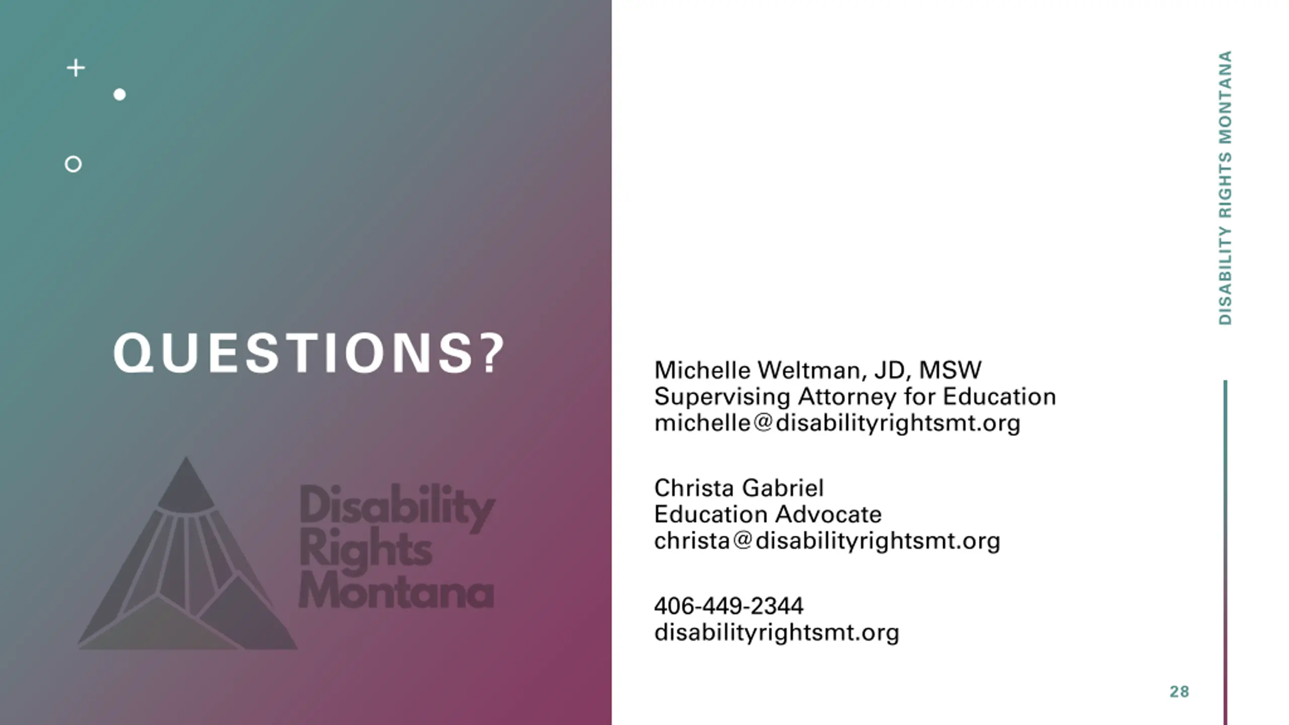 DISABILITY RIGHTS MONTANA QUESTIONS? Michelle Weltman, JD, MSW Supervising Attorney for Education michelle@disabilityrightsmt.org Christa Gabriel Education Advocate christa@disabilityrightsmt.org 406-449-2344 disabilityrightsmt.org 28