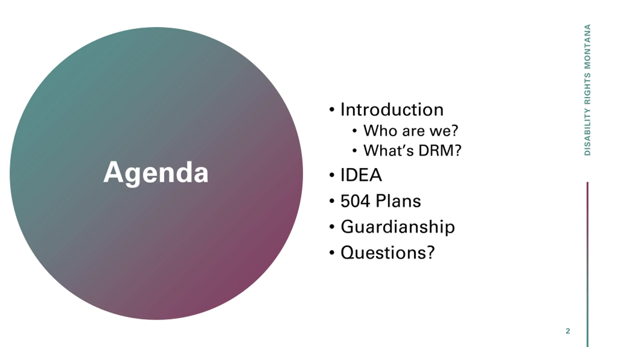 DISABILITY RIGHTS MONTANA Introduction Who are we? What s DRM? IDEA 504 Plans Guardianship Questions? Agenda 2