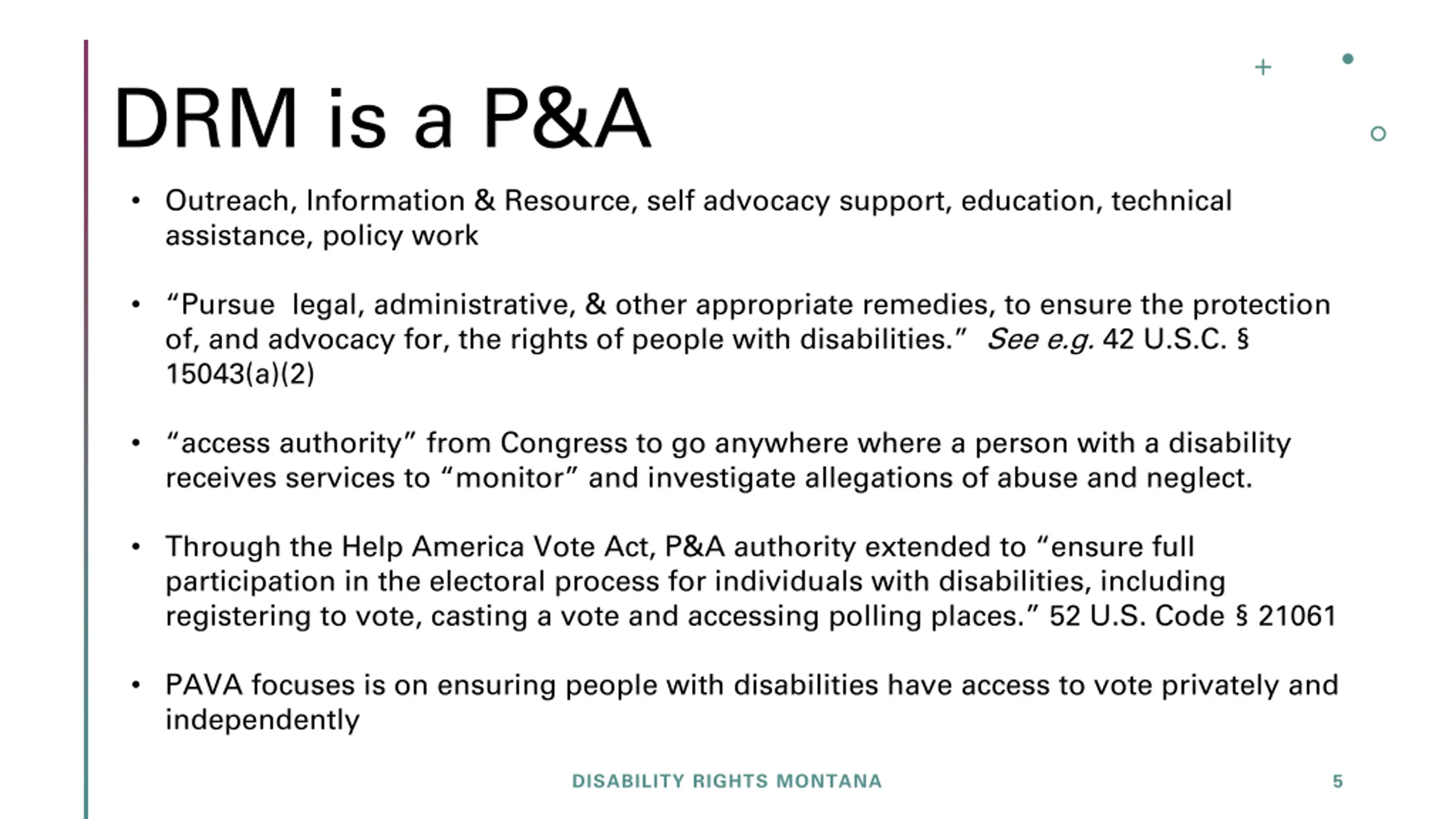DRM is a P&A Outreach, Information & Resource, self advocacy support, education, technical assistance, policy work Pursue legal, administrative, & other appropriate remedies, to ensure the protection of, and advocacy for, the rights of people with disabilities. See e.g. 42 U.S.C. 15043(a)(2) access authority from Congress to go anywhere where a person with a disability receives services to monitor and investigate allegations of abuse and neglect. Through the Help America Vote Act, P&A authority extended to ensure full participation in the electoral process for individuals with disabilities, including registering to vote, casting a vote and accessing polling places. 52 U.S. Code 21061 PAVA focuses is on ensuring people with disabilities have access to vote privately and independently DISABILITY RIGHTS MONTANA 5