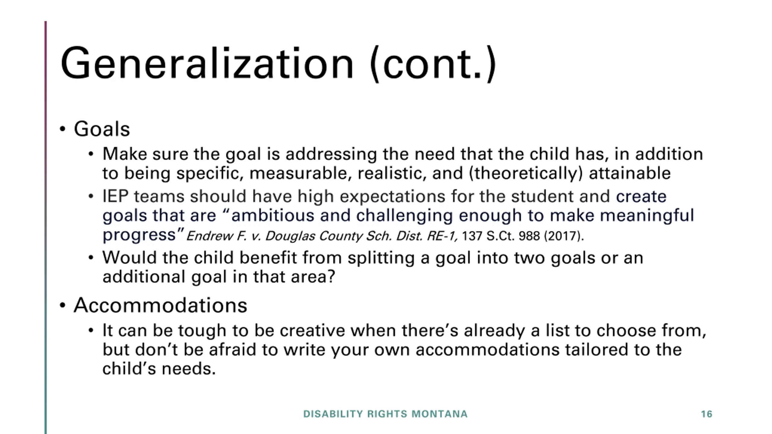 Generalization (cont.) Goals Make sure the goal is addressing the need that the child has, in addition to being specific, measurable, realistic, and (theoretically) attainable IEP teams should have high expectations for the student and create goals that are ambitious and challenging enough to make meaningful progress Endrew F. v. Douglas County Sch. Dist. RE-1, 137 S.Ct. 988 (2017). Would the child benefit from splitting a goal into two goals or an additional goal in that area? Accommodations It can be tough to be creative when there s already a list to choose from, but don t be afraid to write your own accommodations tailored to the child s needs. DISABILITY RIGHTS MONTANA 16