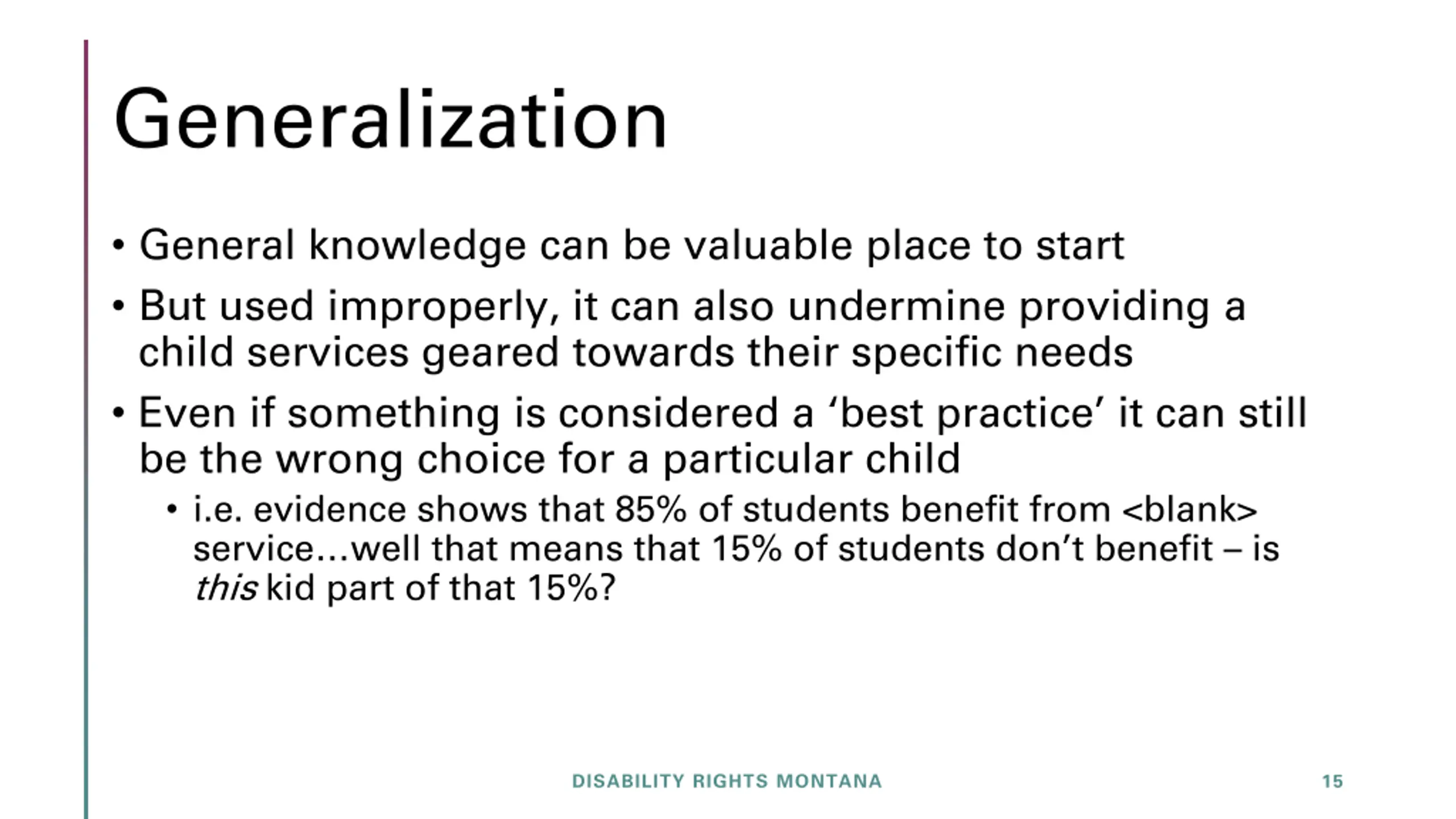 Generalization General knowledge can be valuable place to start But used improperly, it can also undermine providing a child services geared towards their specific needs Even if something is considered a best practice it can still be the wrong choice for a particular child i.e. evidence shows that 85% of students benefit from <blank> service well that means that 15% of students don t benefit is this kid part of that 15%? DISABILITY RIGHTS MONTANA 15