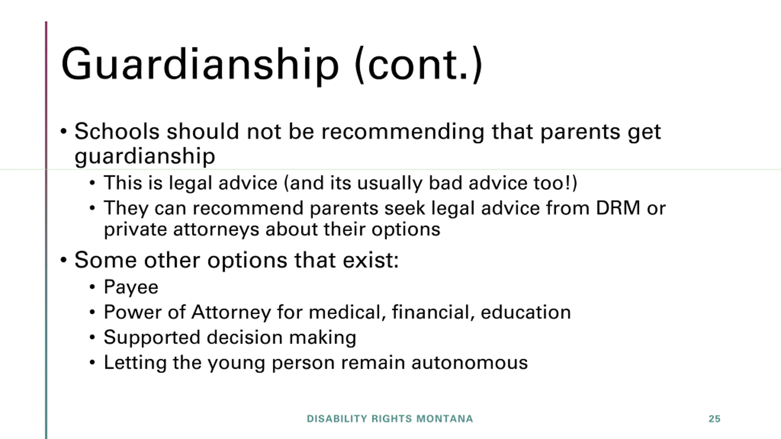 Guardianship (cont.) Schools should not be recommending that parents get guardianship This is legal advice (and its usually bad advice too!) They can recommend parents seek legal advice from DRM or private attorneys about their options Some other options that exist: Payee Power of Attorney for medical, financial, education Supported decision making Letting the young person remain autonomous DISABILITY RIGHTS MONTANA 25