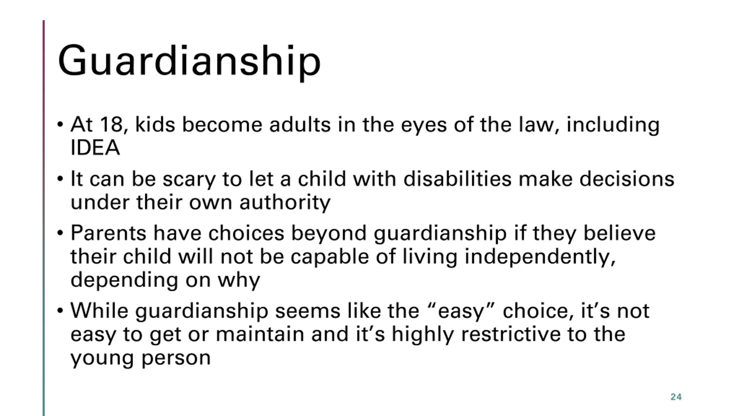 Guardianship At 18, kids become adults in the eyes of the law, including IDEA It can be scary to let a child with disabilities make decisions under their own authority Parents have choices beyond guardianship if they believe their child will not be capable of living independently, depending on why While guardianship seems like the easy choice, it s not easy to get or maintain and it s highly restrictive to the young person 24