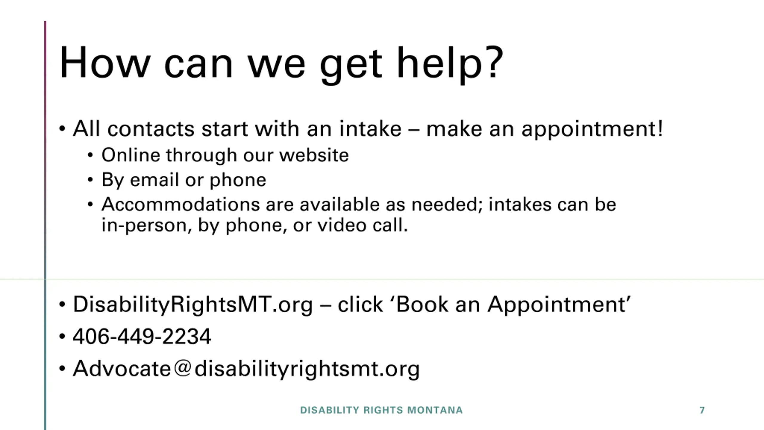 How can we get help? All contacts start with an intake make an appointment! Online through our website By email or phone Accommodations are available as needed; intakes can be in-person, by phone, or video call. DisabilityRightsMT.org click Book an Appointment 406-449-2234 Advocate@disabilityrightsmt.org DISABILITY RIGHTS MONTANA 7