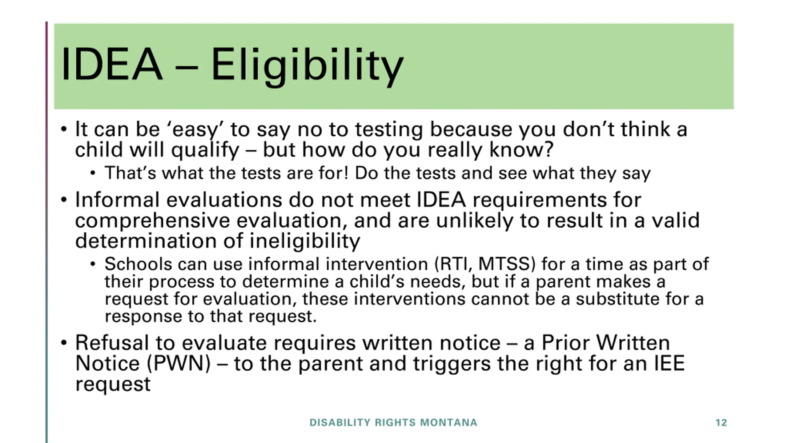 IDEA Eligibility It can be easy to say no to testing because you don t think a child will qualify but how do you really know? That s what the tests are for! Do the tests and see what they say Informal evaluations do not meet IDEA requirements for comprehensive evaluation, and are unlikely to result in a valid determination of ineligibility Schools can use informal intervention (RTI, MTSS) for a time as part of their process to determine a child s needs, but if a parent makes a request for evaluation, these interventions cannot be a substitute for a response to that request. Refusal to evaluate requires written notice a Prior Written Notice (PWN) to the parent and triggers the right for an IEE request DISABILITY RIGHTS MONTANA 12