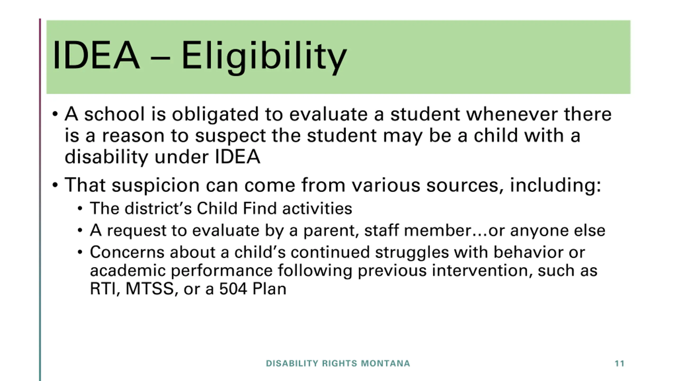 IDEA Eligibility A school is obligated to evaluate a student whenever there is a reason to suspect the student may be a child with a disability under IDEA That suspicion can come from various sources, including: The district s Child Find activities A request to evaluate by a parent, staff member or anyone else Concerns about a child s continued struggles with behavior or academic performance following previous intervention, such as RTI, MTSS, or a 504 Plan DISABILITY RIGHTS MONTANA 11