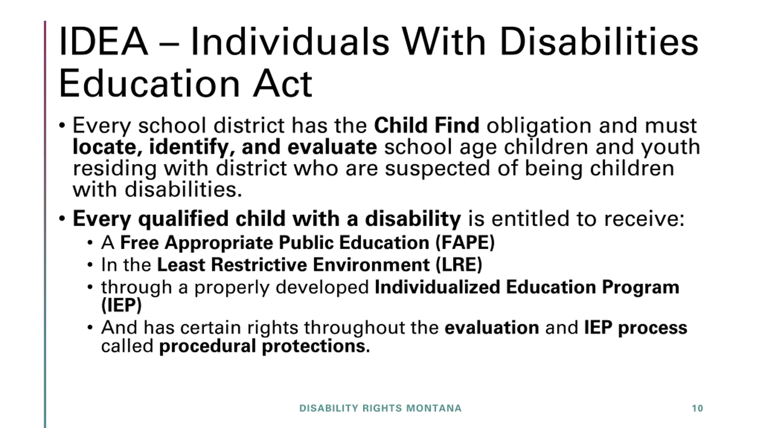 IDEA Individuals With Disabilities Education Act Every school district has the Child Find obligation and must locate, identify, and evaluate school age children and youth residing with district who are suspected of being children with disabilities. Every qualified child with a disability is entitled to receive: A Free Appropriate Public Education (FAPE) In the Least Restrictive Environment (LRE) through a properly developed Individualized Education Program (IEP) And has certain rights throughout the evaluation and IEP process called procedural protections. DISABILITY RIGHTS MONTANA 10