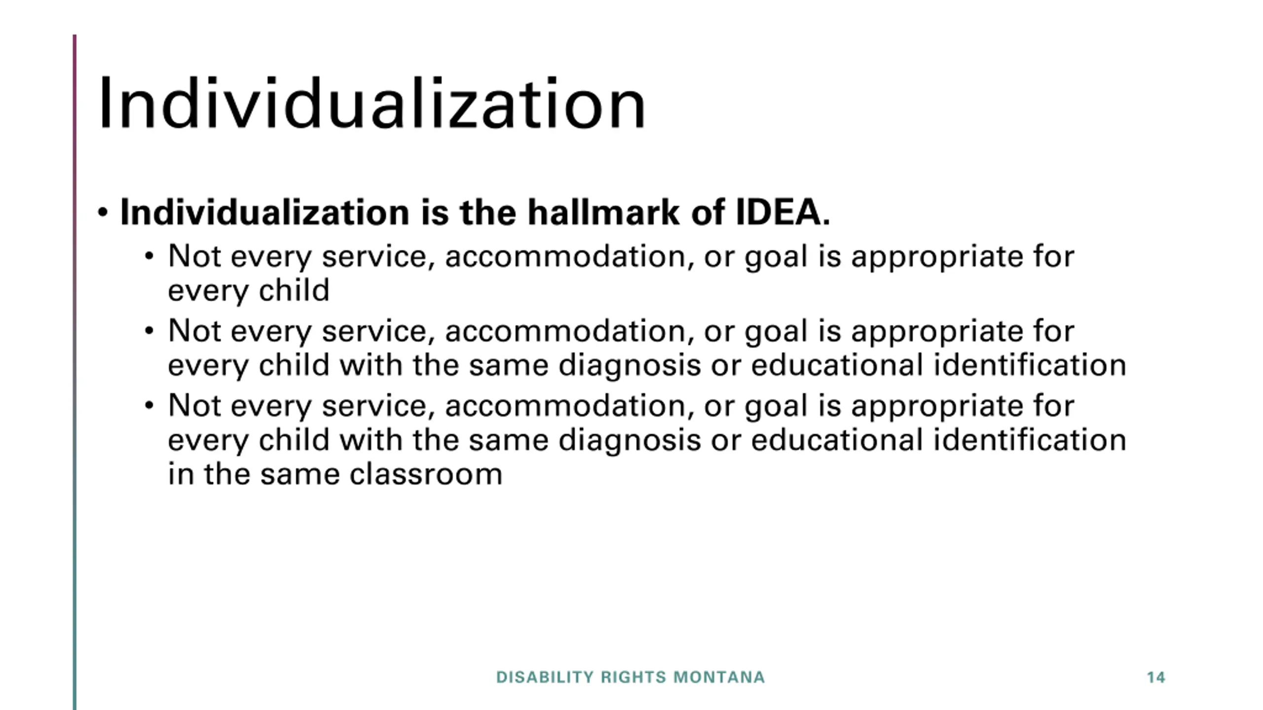 Individualization Individualization is the hallmark of IDEA. Not every service, accommodation, or goal is appropriate for every child Not every service, accommodation, or goal is appropriate for every child with the same diagnosis or educational identification Not every service, accommodation, or goal is appropriate for every child with the same diagnosis or educational identification in the same classroom DISABILITY RIGHTS MONTANA 14