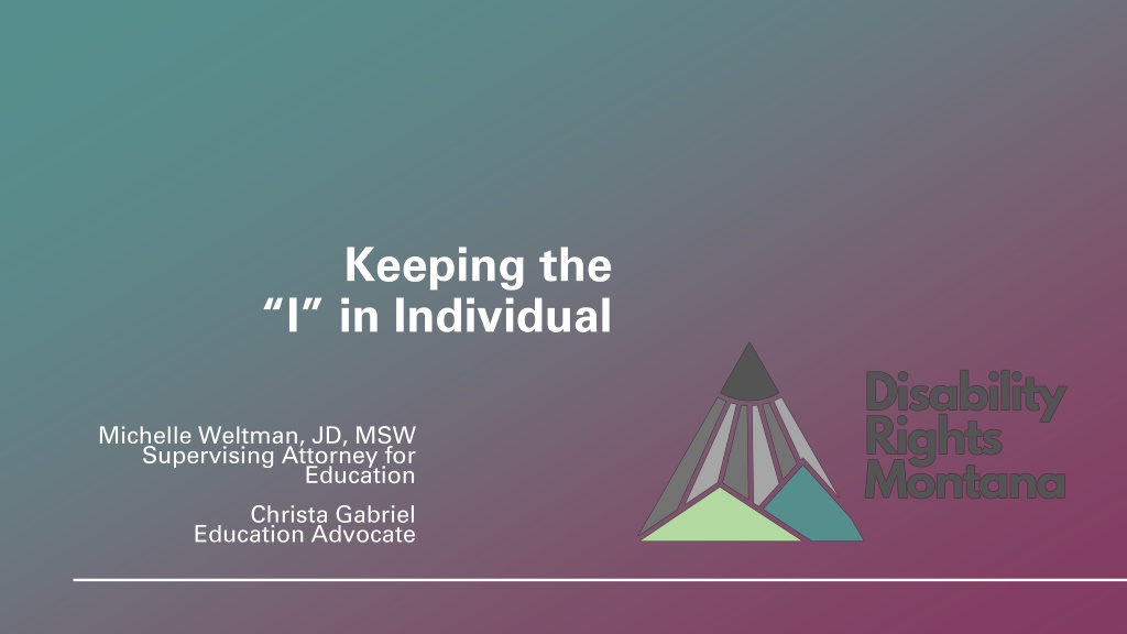 Keeping the I in Individual Michelle Weltman, JD, MSW Supervising Attorney for Education Christa Gabriel Education Advocate