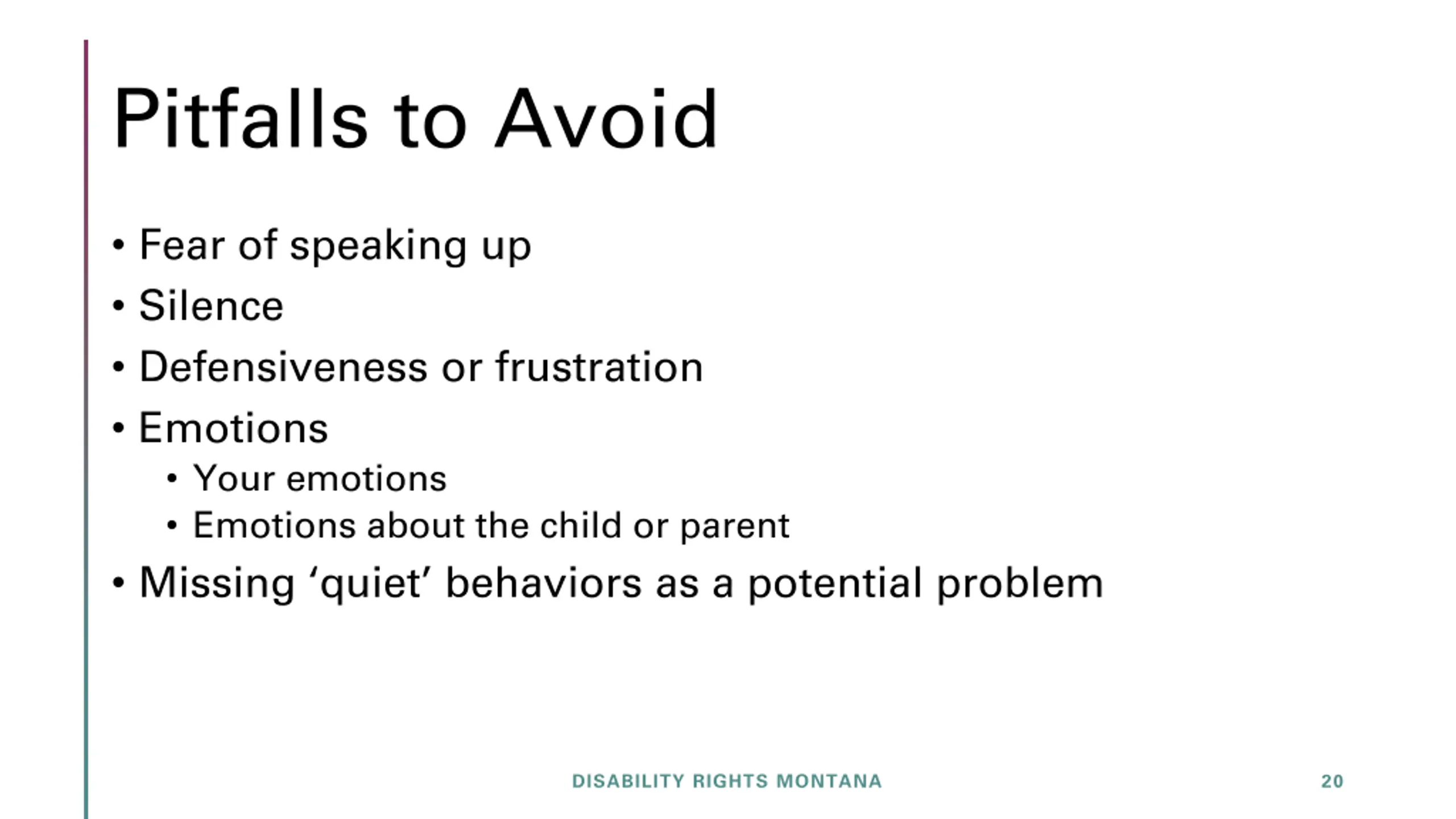 Pitfalls to Avoid Fear of speaking up Silence Defensiveness or frustration Emotions Your emotions Emotions about the child or parent Missing quiet behaviors as a potential problem DISABILITY RIGHTS MONTANA 20