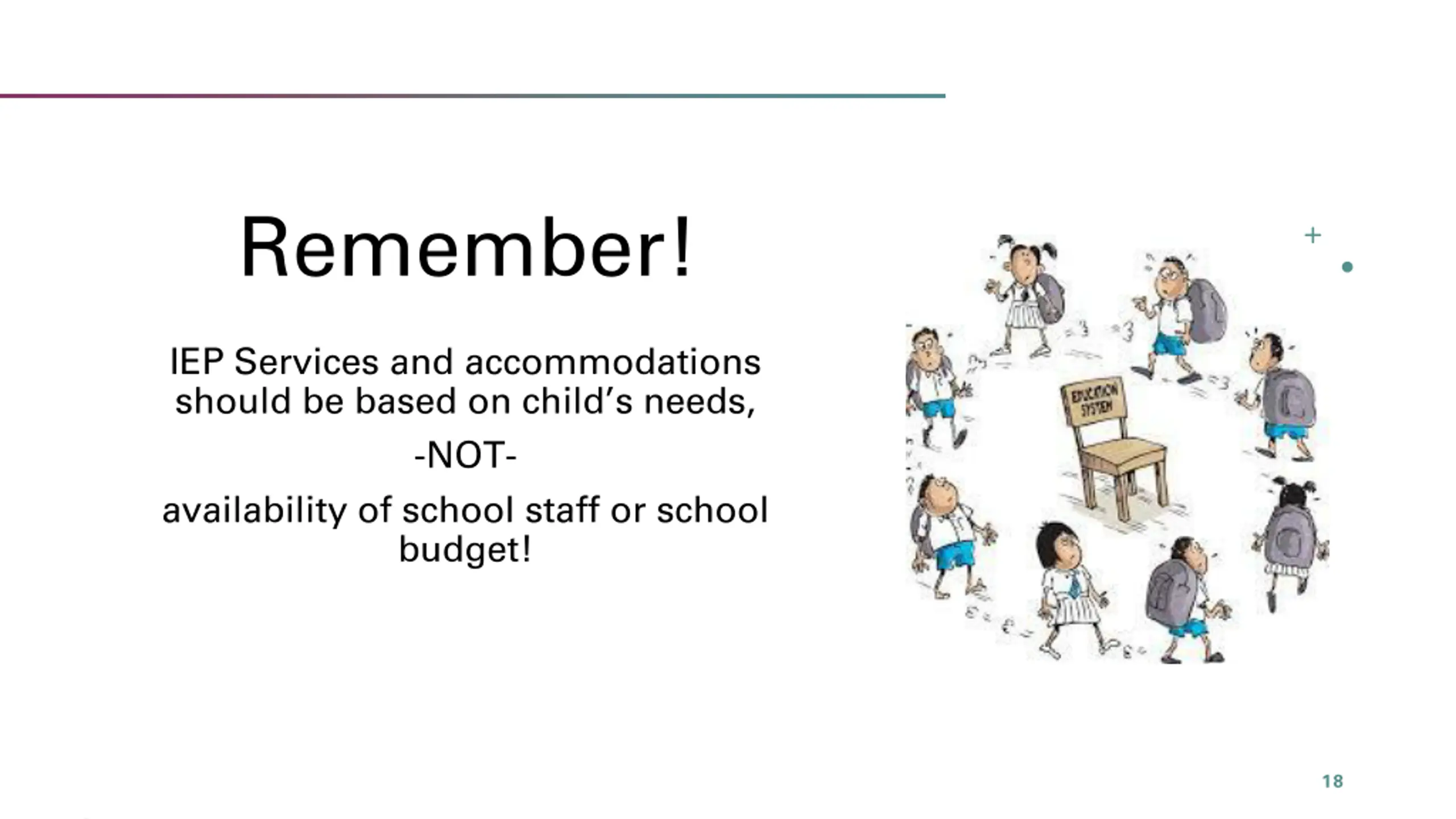 Remember! IEP Services and accommodations should be based on child s needs, -NOT- availability of school staff or school budget! 18