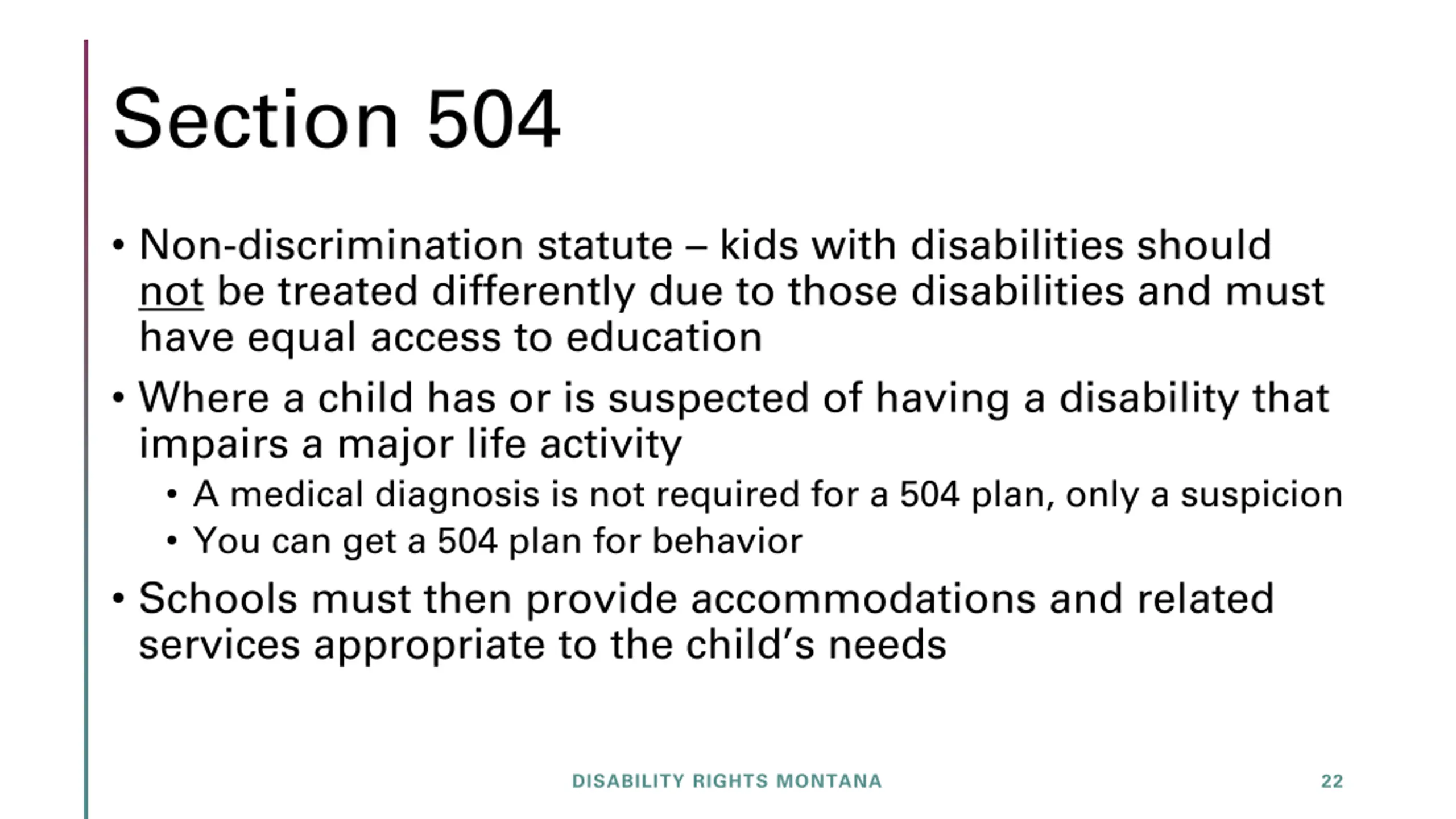Section 504 Non-discrimination statute kids with disabilities should not be treated differently due to those disabilities and must have equal access to education Where a child has or is suspected of having a disability that impairs a major life activity A medical diagnosis is not required for a 504 plan, only a suspicion You can get a 504 plan for behavior Schools must then provide accommodations and related services appropriate to the child s needs DISABILITY RIGHTS MONTANA 22