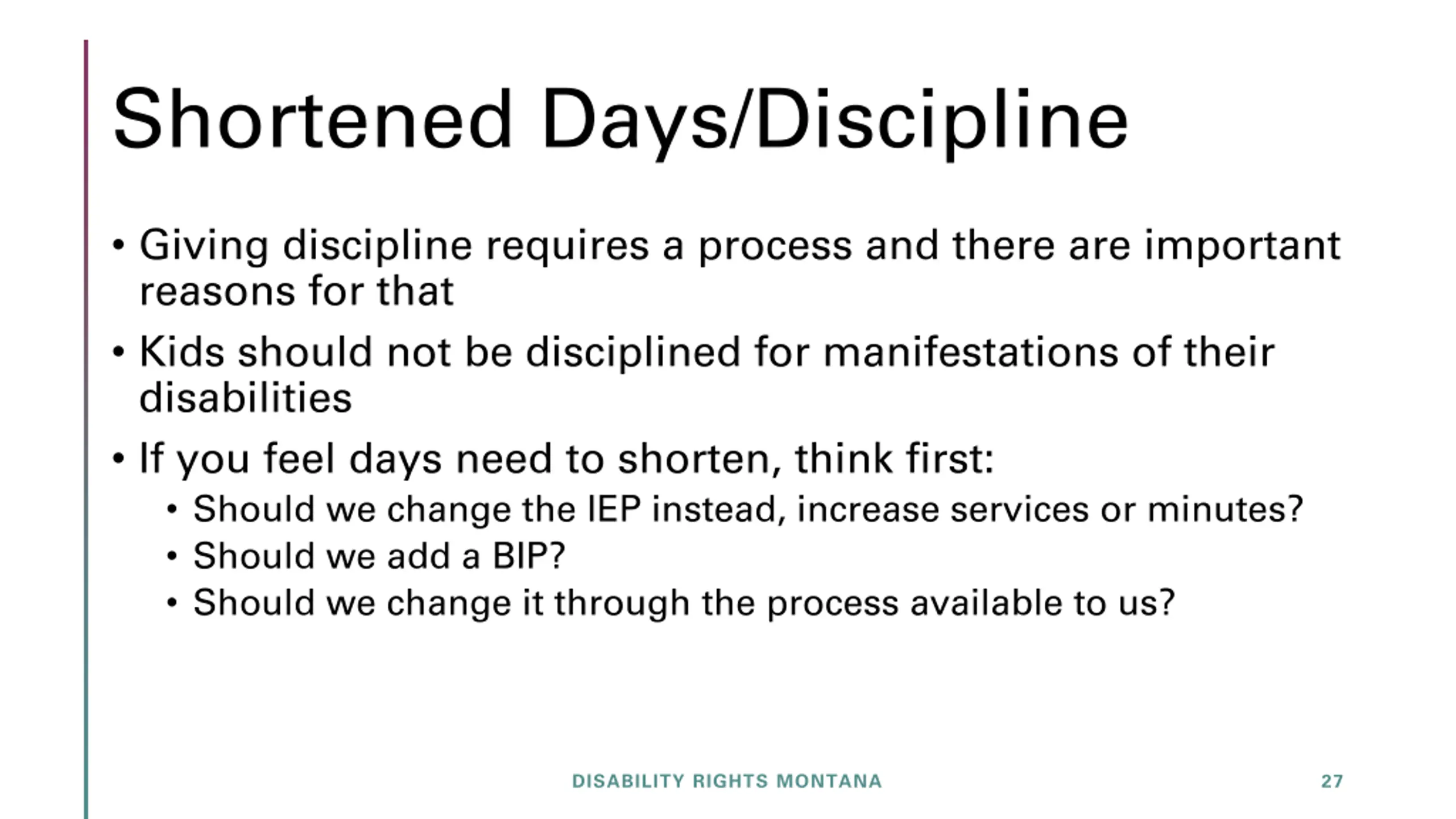 Shortened Days/Discipline Giving discipline requires a process and there are important reasons for that Kids should not be disciplined for manifestations of their disabilities If you feel days need to shorten, think first: Should we change the IEP instead, increase services or minutes? Should we add a BIP? Should we change it through the process available to us? DISABILITY RIGHTS MONTANA 27